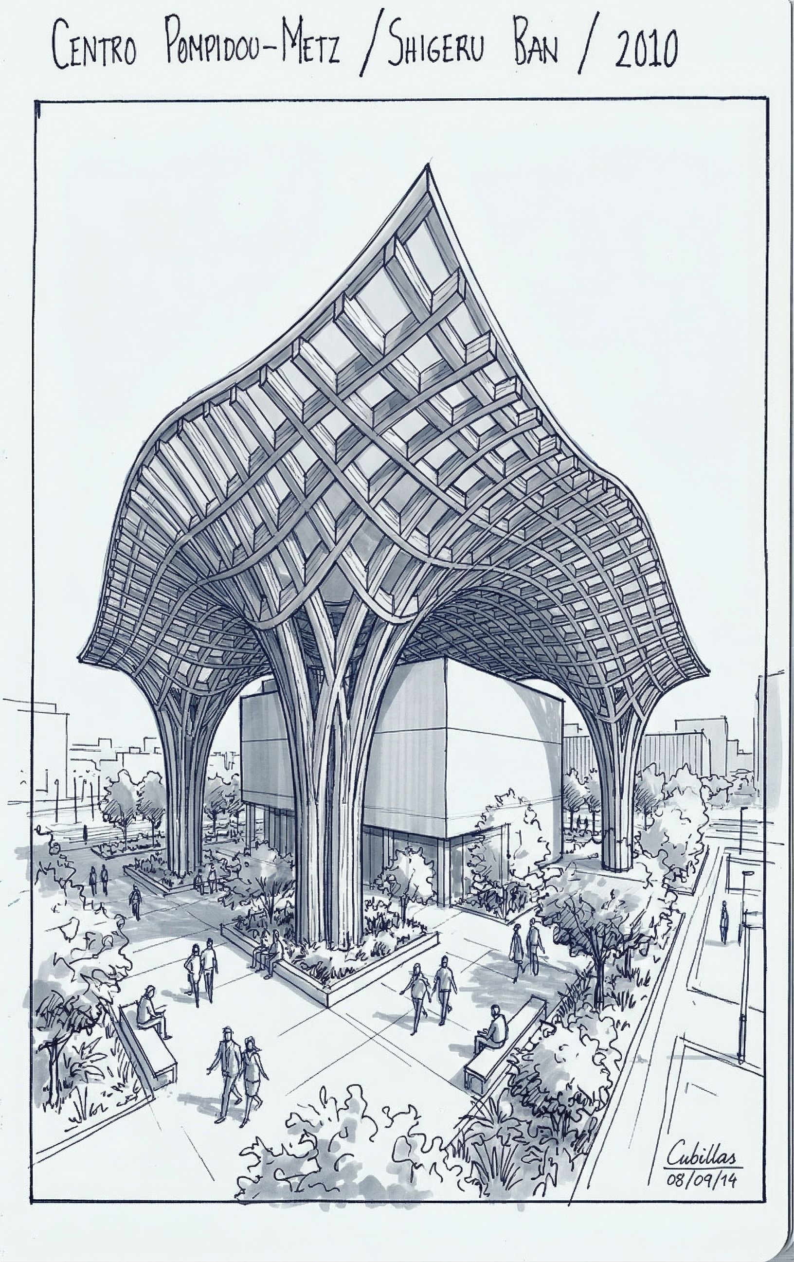 PromptDO NOT CHANGE THE SHAPE. ONLY CHANGE HOW IT LOOKS AND HOW THE STRUCTURE IS EXPRESSED. Keep the exact original geometry, proportions, footprint, and layout of the roof and the building underneath. Do NOT redesign or modify the form in any way. Keep the exact same camera view, perspective, angle, and composition. Do NOT move or adjust the camera. Task: Transform the model visually and structurally in expression only: 1) Style: Redraw the model in the same visual style as the reference image Adjust linework, shading, colors, and atmosphere Match the graphic language (clean / sketch / render style) 2) Structural expression: Reinterpret the roof using a Metropol Parasol (Seville)–inspired timber system Replace current elements with a wooden grid / lattice (waffle structure) Use repeating wooden ribs and beams following the exact surface The structure must: strictly follow the original roof shape look like a continuous unified wooden system be clean, rhythmic, and buildable 3) Columns: Transform supports into more massive, branching wooden columns Columns should grow into the roof structure (tree-like connection) Keep their general positions, only refine their form Important: Do NOT change the shape Do NOT change proportions or layout Do NOT redesign the building Do NOT add new forms ONLY change visual style and structural expression Output: same model, new presentation and structural expression wooden architectural system (Metropol Parasol inspired)...identical geometry, different material and structure language only