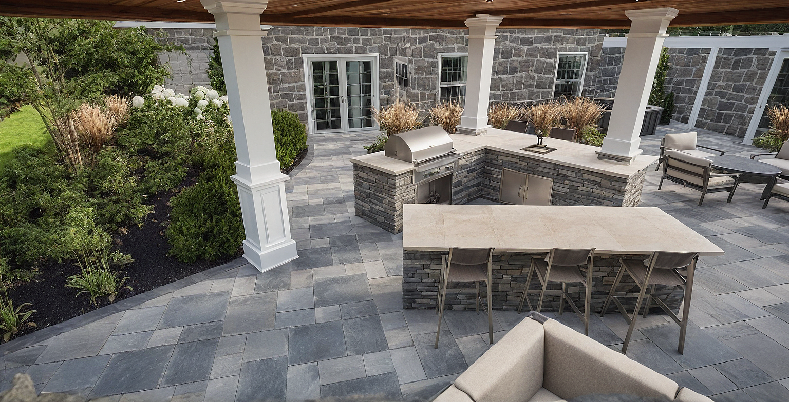 landscaping, bluestone patio, white fireplace, cedar ceiling