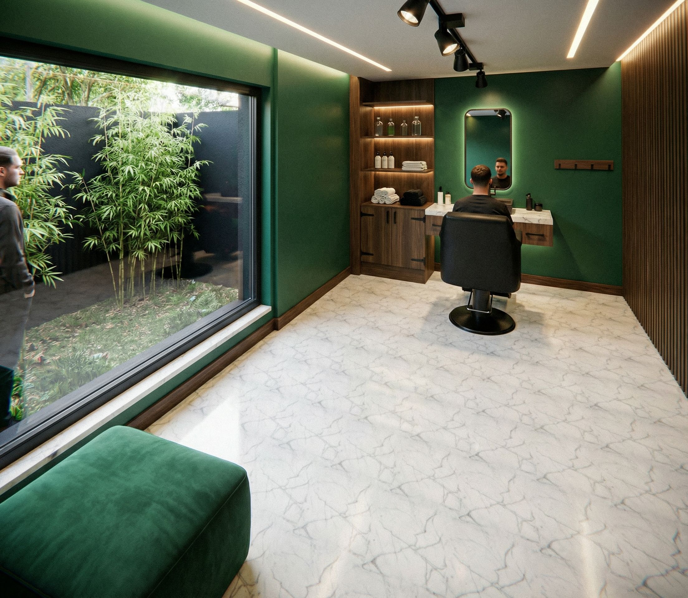 Promptdon change the angle and the furniture the ceiling has black spot lights in the middle and a slit which is for horizontal LED lights. On the right edge and thefront edge there are 12 cm opening also for the LED lights. On the right side the wall is covered with dark oak lamellen and as background emerald green the front wall is emerald green with satin texture colour. just as the wall on the left The counter top is white marmor and the cupboards beneath are dark oak. add bottles and towels on top of the shelving systemmake the whole system also in dark oak and the hinges beneath black. on the left wall there is a window display opening to a small garden which is planted with bamboo plans. that garden is covered with walls which are dyed in black left bottom corner there is a emerald green flooring is white marmor aswell. and the skirting board is out of dark oak, keep exact camera angle