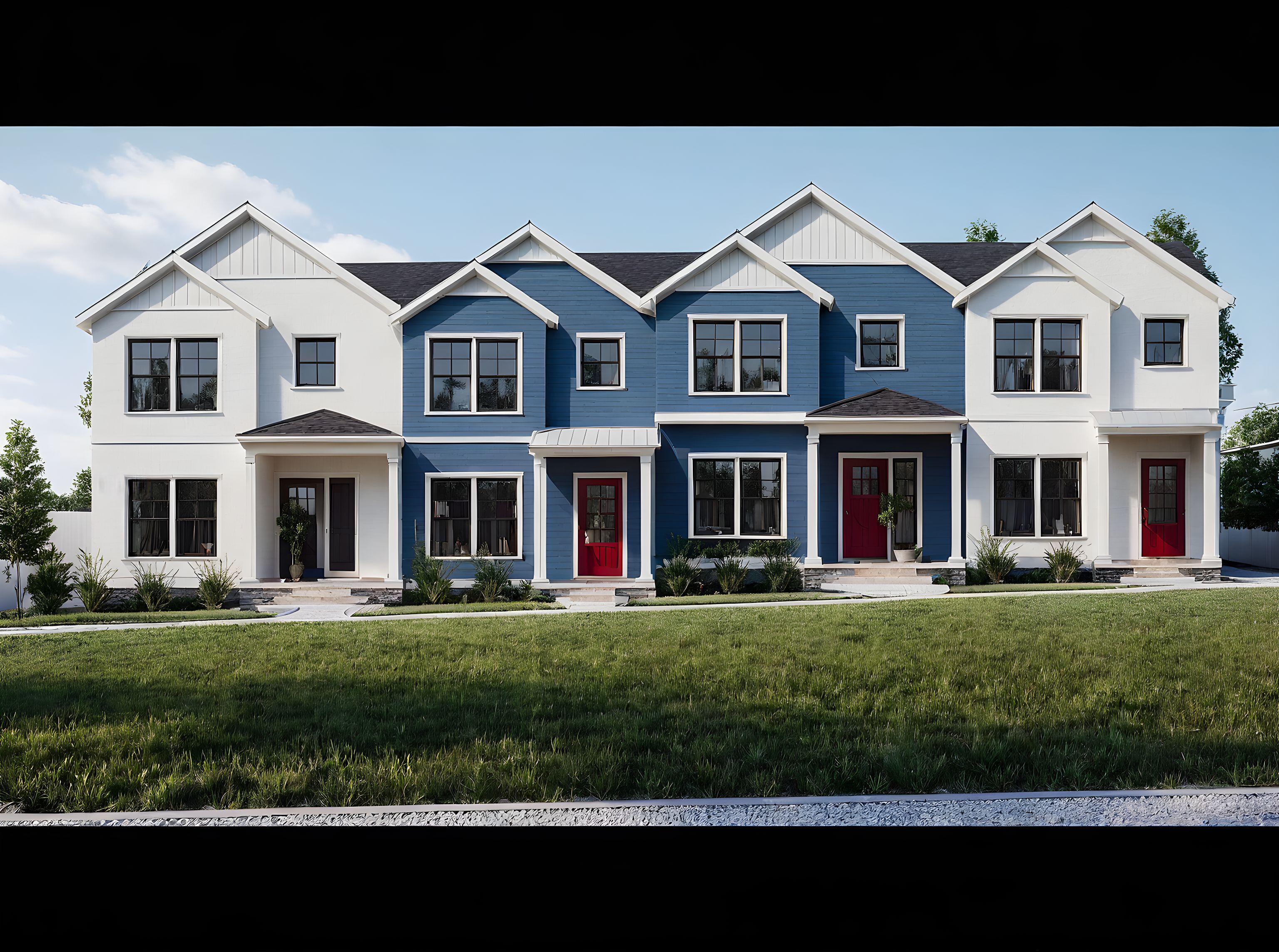 PromptModern style Rowhouses with a homey outside feel. Outer left house : white tones all over, inner left house : blue tones all over, inner right house : brown tones on top and door panel with a red section on the left of the door, outer right house : white tones all over