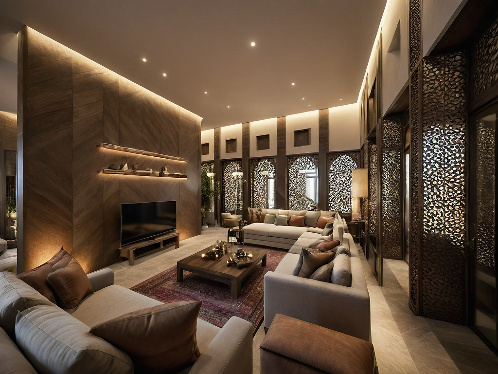 PromptInterior view of a guest room. the decoration is of a middle east look