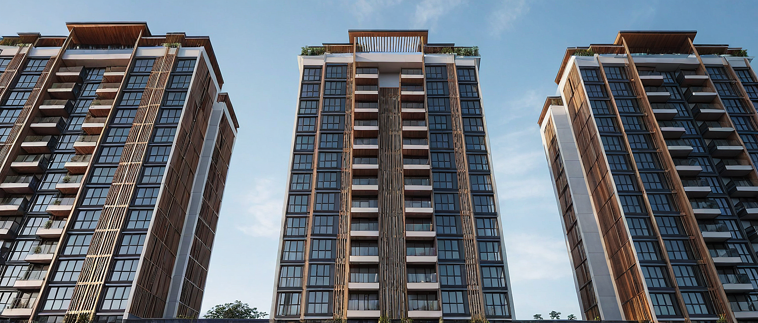 Promptmodern residential building in urban context with wooden fins on building crown