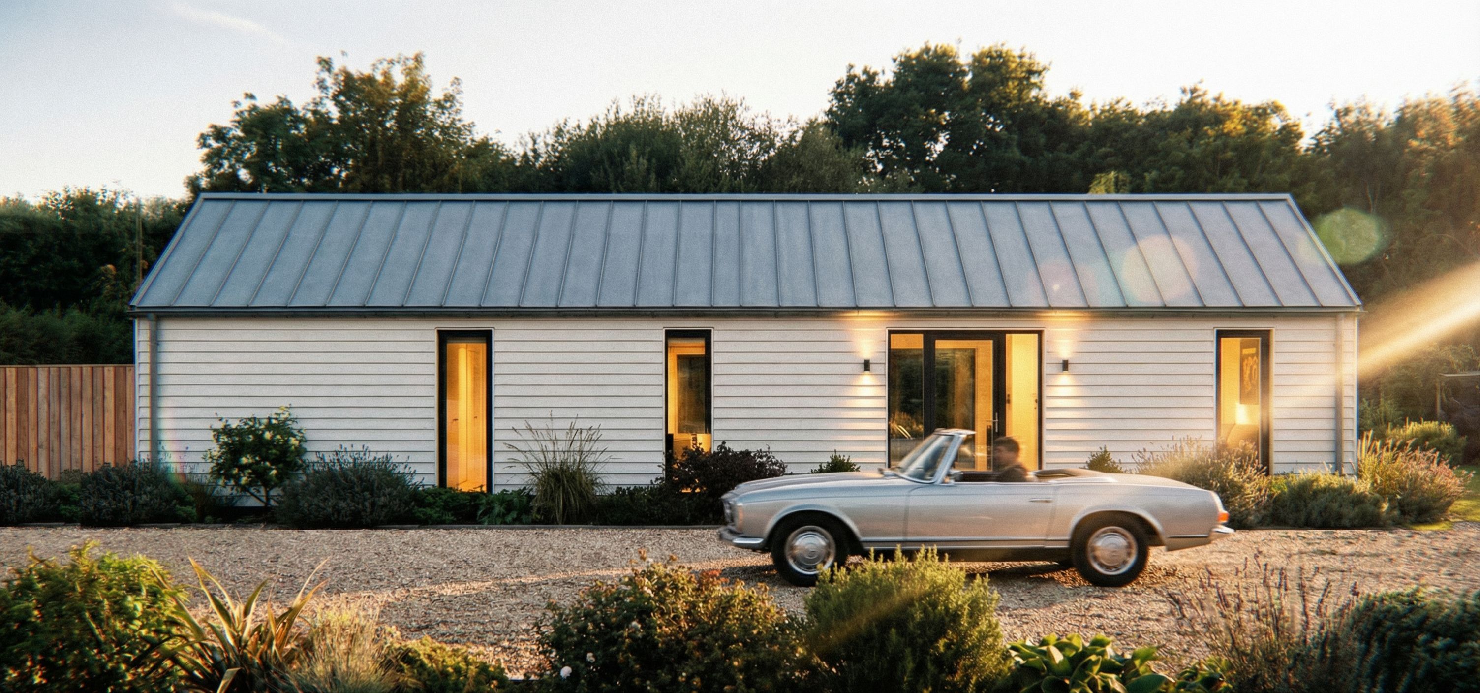 Promptchange cedar cladding to horizontal white boarding Add car passing, keep exact camera angle