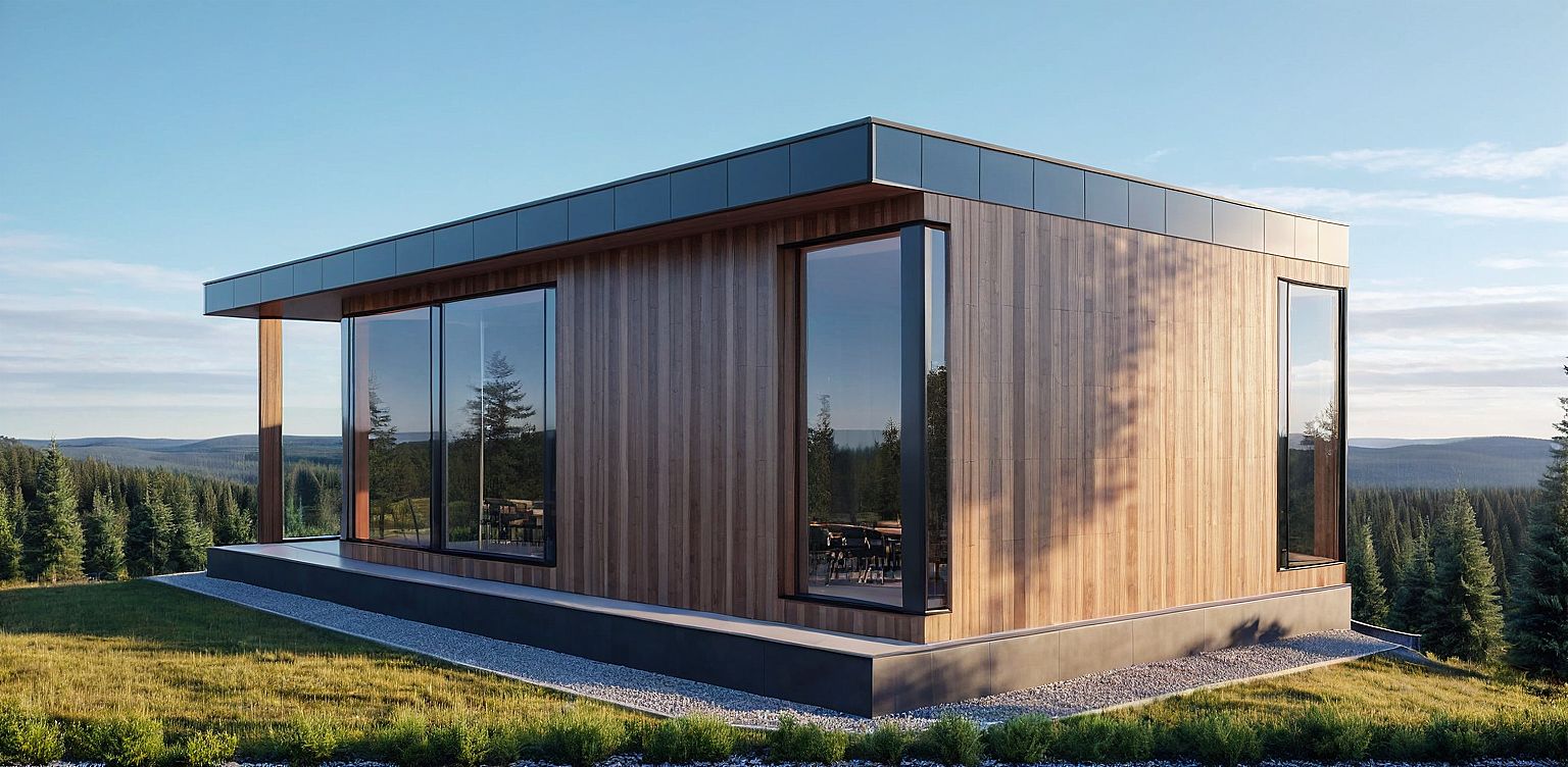 modern high-tech house with panoramic windows and with an outdoor terrace. Against the background of a coniferous forest.