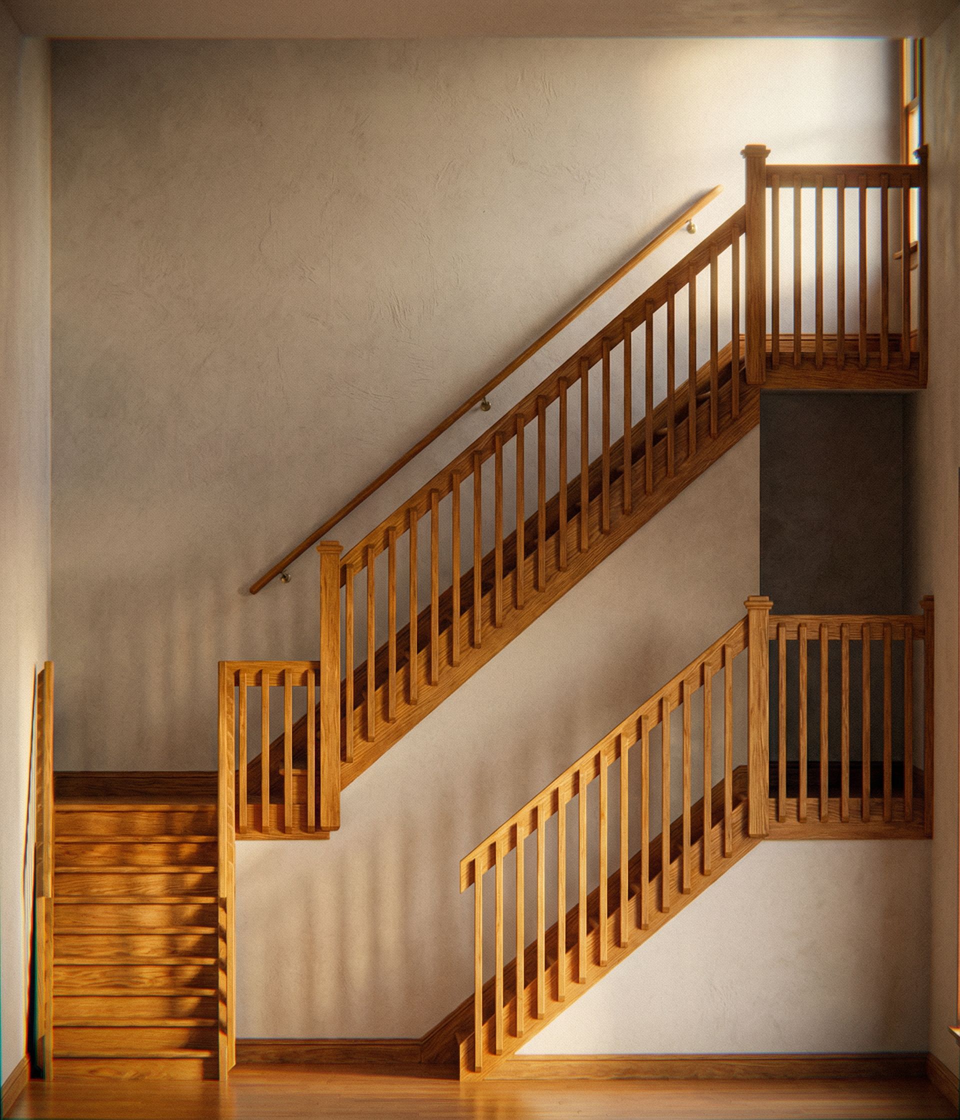 Promptthis is a staircase design that i would like to see more realistic. the brown is a warm honey white oak, keep exact camera angle