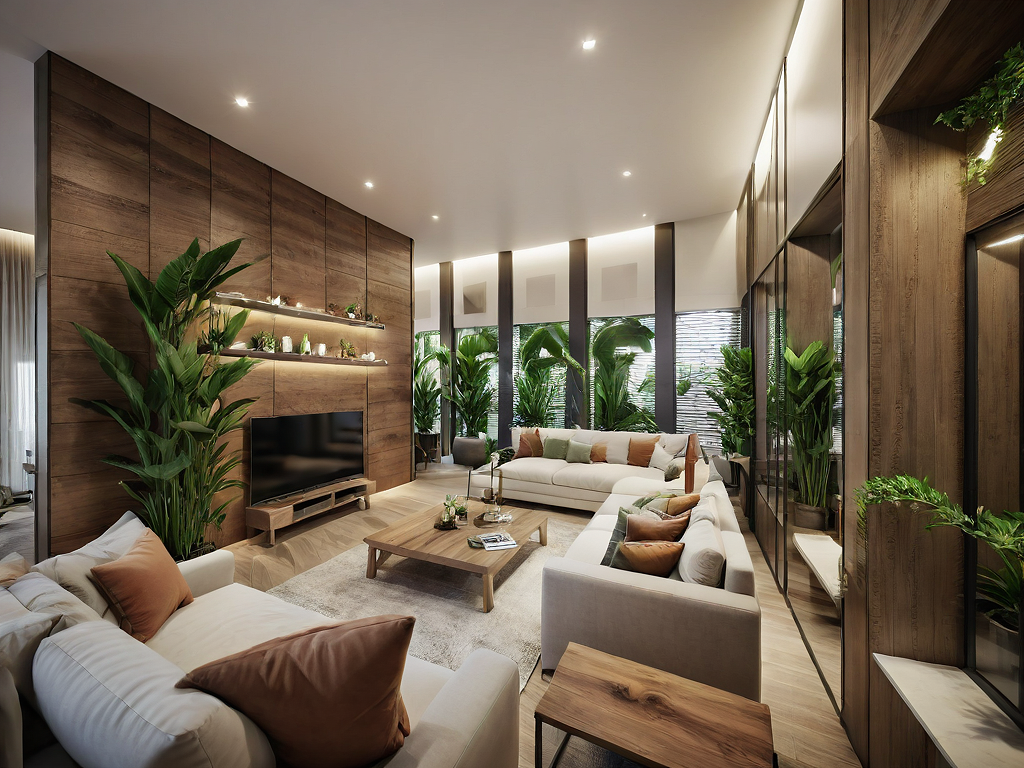 PromptInterior view of a guest room with modern decoration and lots of plants