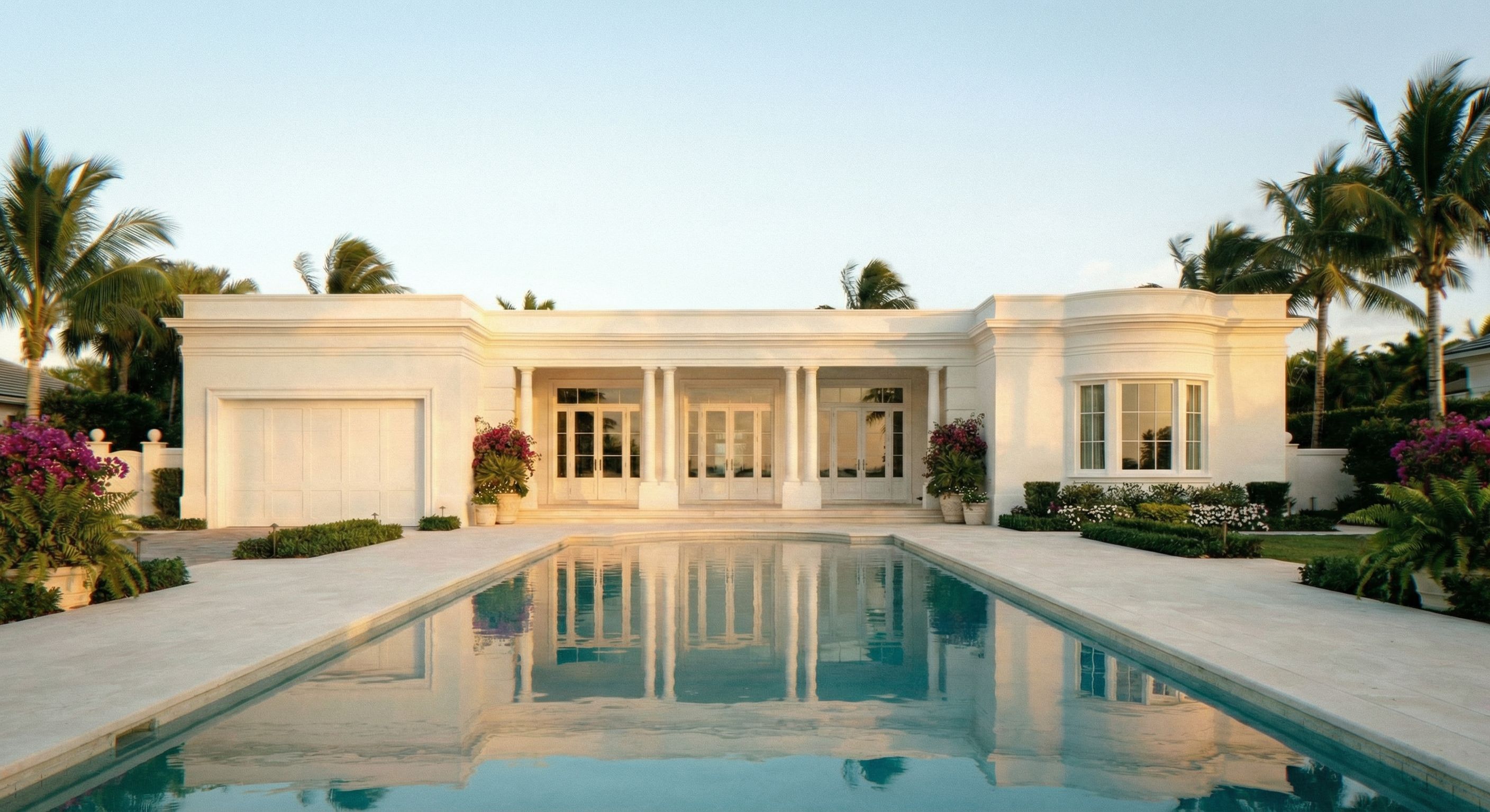 PromptCHANGE ONLY WHAT I TELL YOU. I want another variation of the curved bay window. i want it to suit the style of the house. it needs to be simple and elegant so nothing to elaborate. this is a palm beach regency style house. it should be in proportion following neo classical guidelines and suiting the rest of the house. , keep exact camera angle