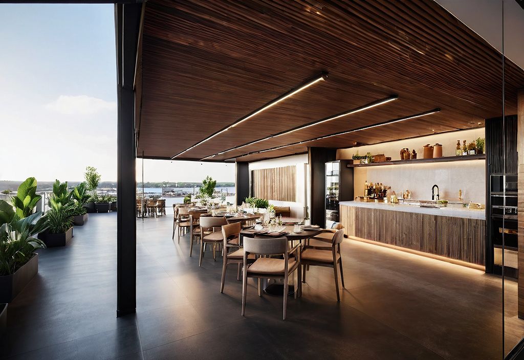 PromptGOURMET AREA IN A ROOFTOP., LOOKING TO A RIVER ON THE BACK, DURING A LIGHT DAY