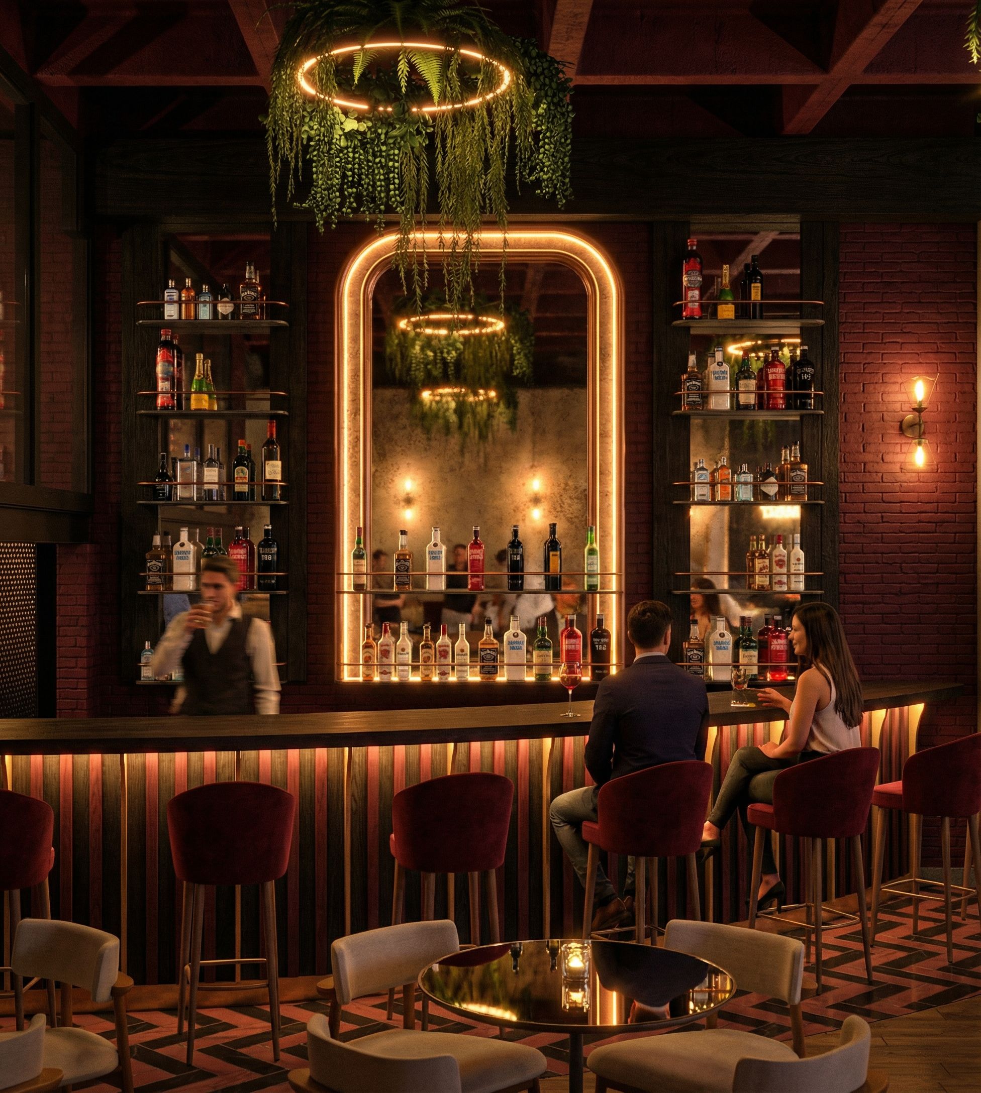 HIGH-END PHOTOREALISTIC INTERIOR RENDER OF A MODERN CANTINA RESTAURANT NAMED BRASA NEGRA.NIGHTTIME ATMOSPHERE WITH AN ELEGANT, VIBRANT AND FESTIVE BAR MOOD INSPIRED BY GLOWING EMBERS AND FIRE GRILLING. DARK AND SOPHISTICATED ENVIROMENT WITH WARM AMBER AND COOPER LIGHTING ACCENTS THAT CREATE A LIVELY NIGHTLIFE EXPIREINCE. CERAMIC WOOD-LOOK FLOORING IN 18X60 CM PLANKS. LUXURY BOOTHS UPHOLSTERED IN AGED VELVET FABRIC IN WINE COLOR, COMBINED WITH NATURAL LIGHT BROWN WOOD BACKRESTS AND ARTIFICIAL GREENERY ABOVE THE BOOTHS. EXPOSED WINE COLOR CONCRETE WAFFLE SLAB CEILING WITH DRAMATIC SHADOWS. WINE COLOR PAINTED BRICK FEATURE WALL FOR DEPTH AND CONTRAST. TV WALL FRAMED SHOU SIGU BAN CHARRED WOOD PANELS. VINTAGE WALL LAMPS ON BOTH SIDES EMITING WARM, LOW LEVEL LIGHT. ONE ARCHITECTURAL ARCHES MADE OF 2-INCH METAL TUBING PAINTED COOPER, SIDE-LIT WITH AMBER LED STRIP LIGHTING, WITH AGED MIRROR BACKGROUND REFLECTING WARM LIGHT AND MOVEMENT.SUSPENDED CIRCULAR CEILING STRUCTURES WITH ARTIFICIAL PLANTS AND INTEGRATED WARM LED LIGHTING, CREATING A FLOATING GARDEN EFFECT, STAIRCASE SIDE COVERED WITH BLACK PERFORATED METAL SHEET, SUBTLY BLACKLIT. TABLES WITH MIRRORED TOPS AND WOODEN, BAR BENCHES IN AGED VELVET FABRIC IN WINE COLOR. THE FLOOR NEXT TO THE BAR IS MADE OF ANTIQUE PASTA TILE, FOLLOWING THE PATTERN SHOWN IN THE PHOTO, COMBINING WINE AND BLACK COLORS. THE BAR COUNTER FEATURES GOOD CINEMATIC LIGHTING, IS MADE OF SHOU SIGU BAN-STYLE WOOD, AND HAS VERTICAL WOOD ACCENTS IN A WINE COLOR. CINEMATIC LIGHTING, HIGH CONTRAST, REALISTIC REFLECTIONS, DEPTH OF FIELD. LUXURY NIGHTLIFE HOSPITALITY DESIGN, ULTRA DETAILED MATERIALS, PREMIUM TEXTURES, PROFESSIONAL ARCHITECTURAL VISUALIZATION, 8K QUALITY. , keep exact camera angle