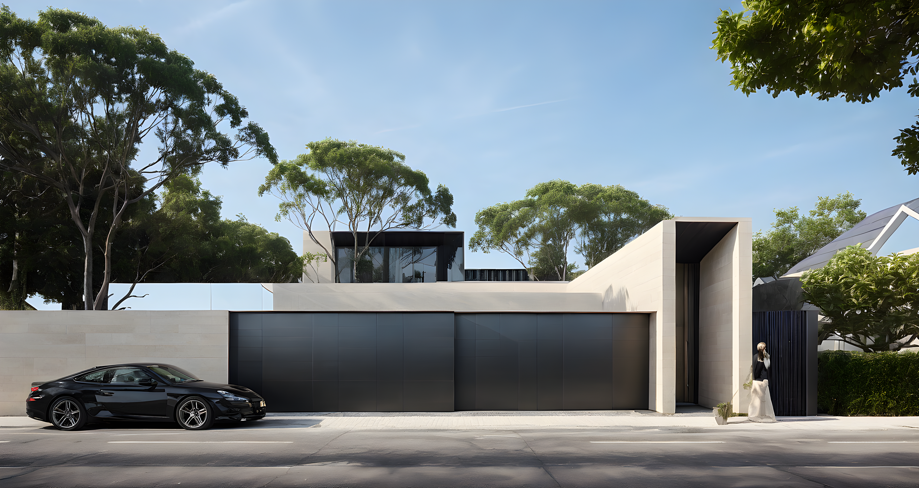 Promptbright day vibrant environment minimal design blackened raw steel facade smooth beige limestone keep road surface without grass and plants