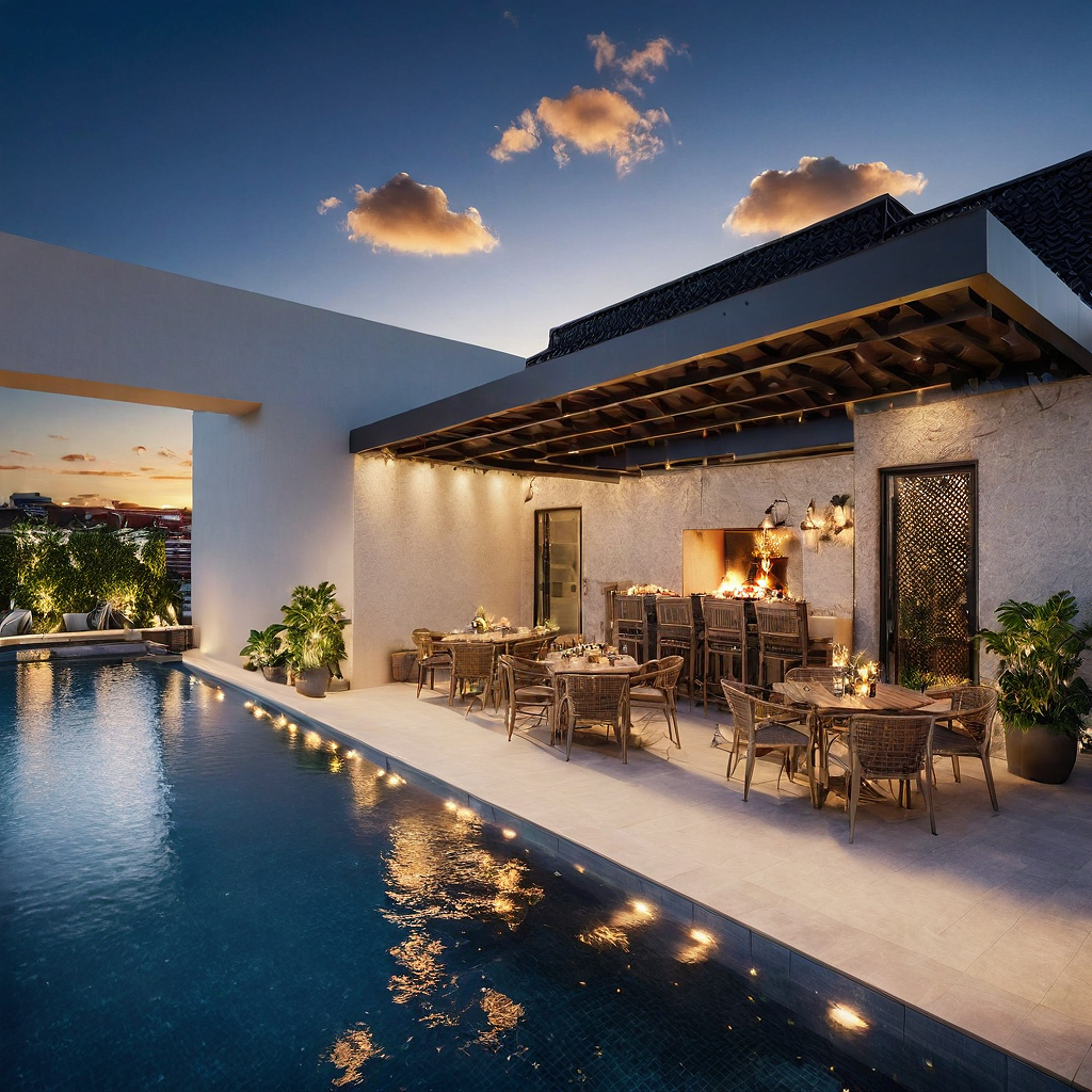 Promptmake this rooftop image with barbecue more realistc, with a beautiful sunrise light. The pool needs to be very realistic and exciting. Need to be the exact same space