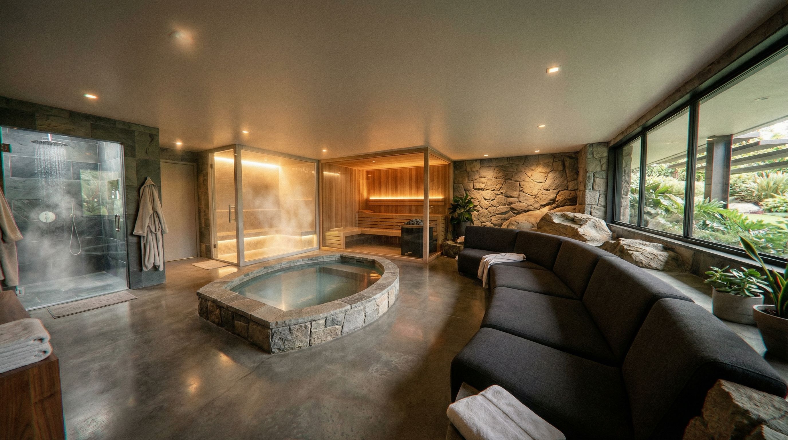 Spa department. Shower on the left box. Steam room in the middle box. Sauna in the right middle box. Stone wall on total right side. There is a small stone swimming pool in the middle. On the right side below the image its natural rock integrated into the spa and sofa. Make like a nice spa., keep exact camera angle