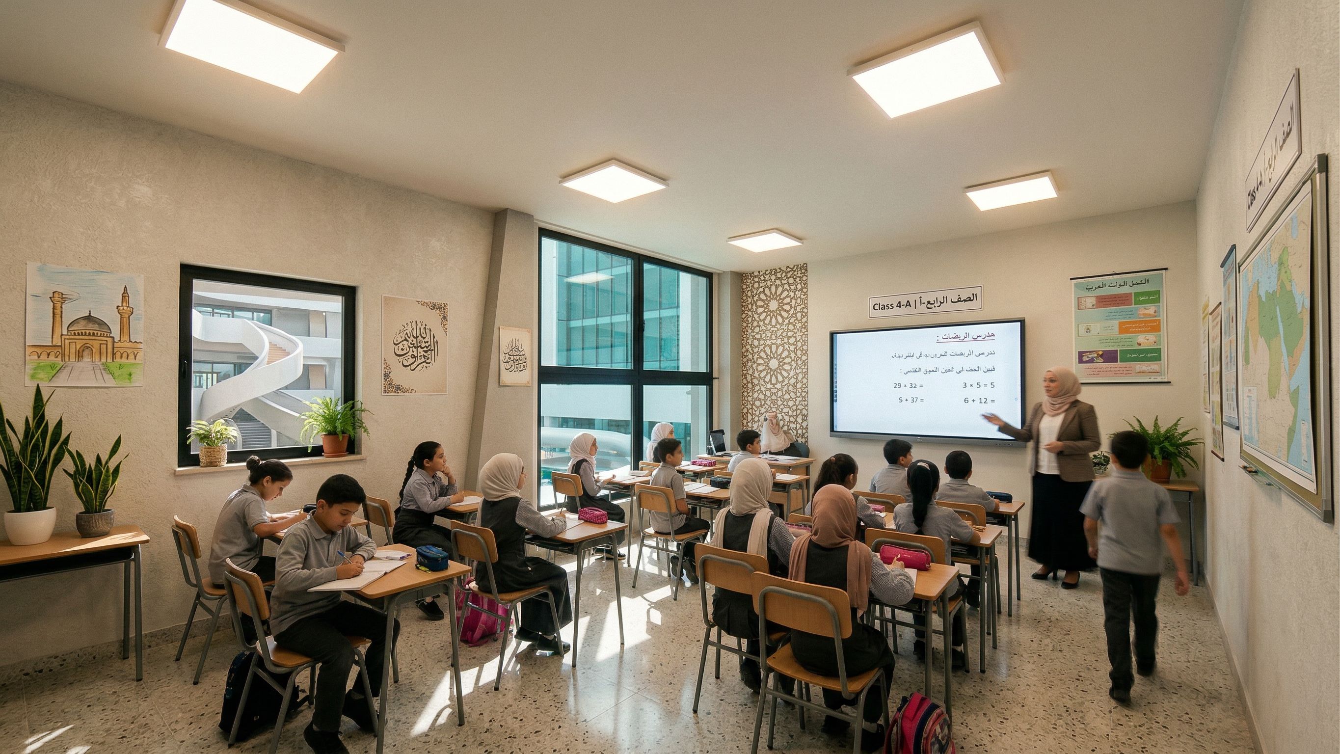 Promptit is the interior 0f a modern Syrian (ARAB) school and it shows the inner classroom ...