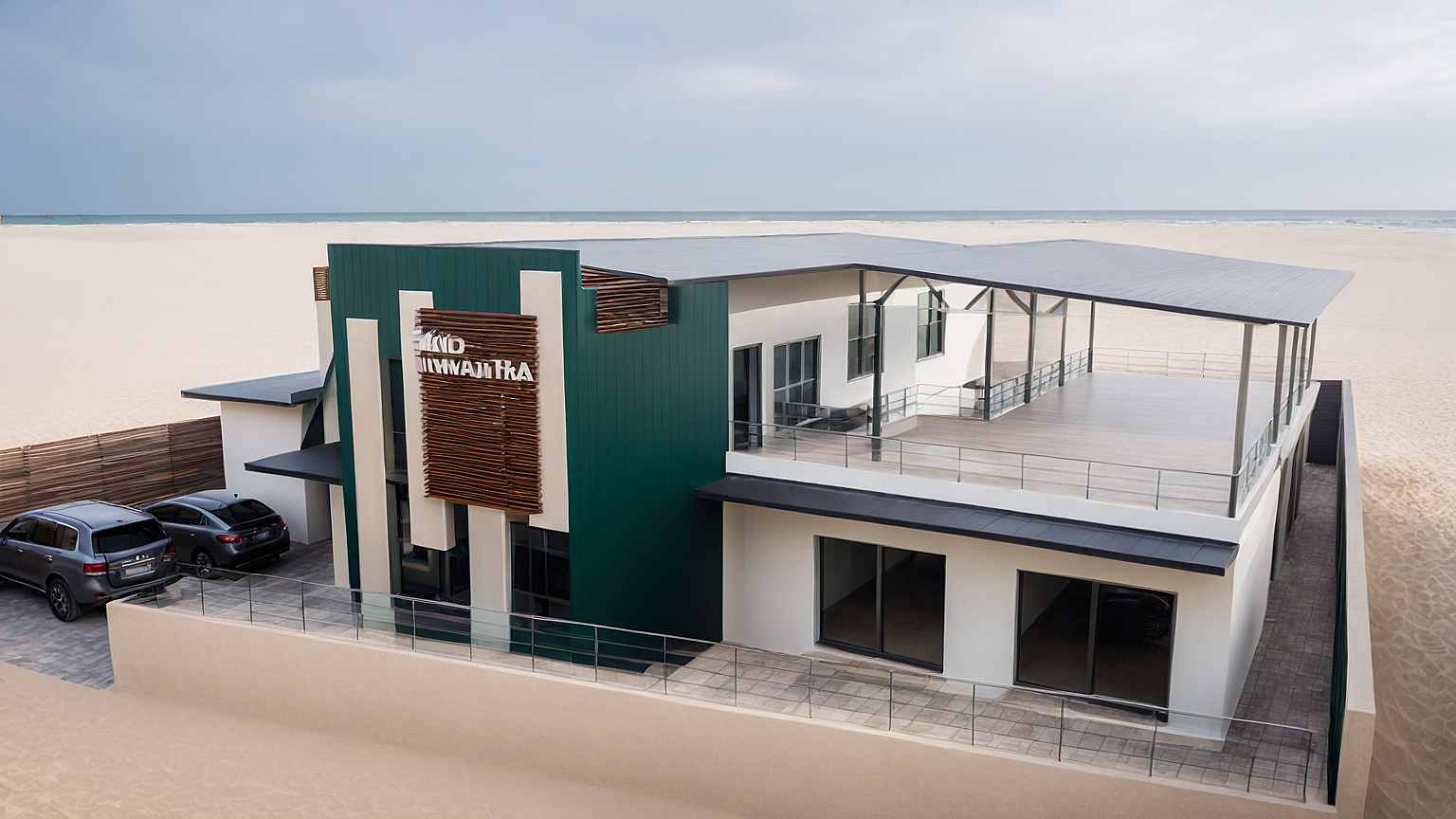 PromptBuilding is a Tech Hub. Maintain existing wall colours, frontal green wall to be aluminium composite panels. Include interior furniture. Interior warm white lights, exterior wall lamps and lights. Few nice cars. Modern sophisticated look. Add trees to rear and sides of property. Road as natural sand. Maintain all colors. Keep the texts as Edfrika Innovation Hub. front road to be natural sand.