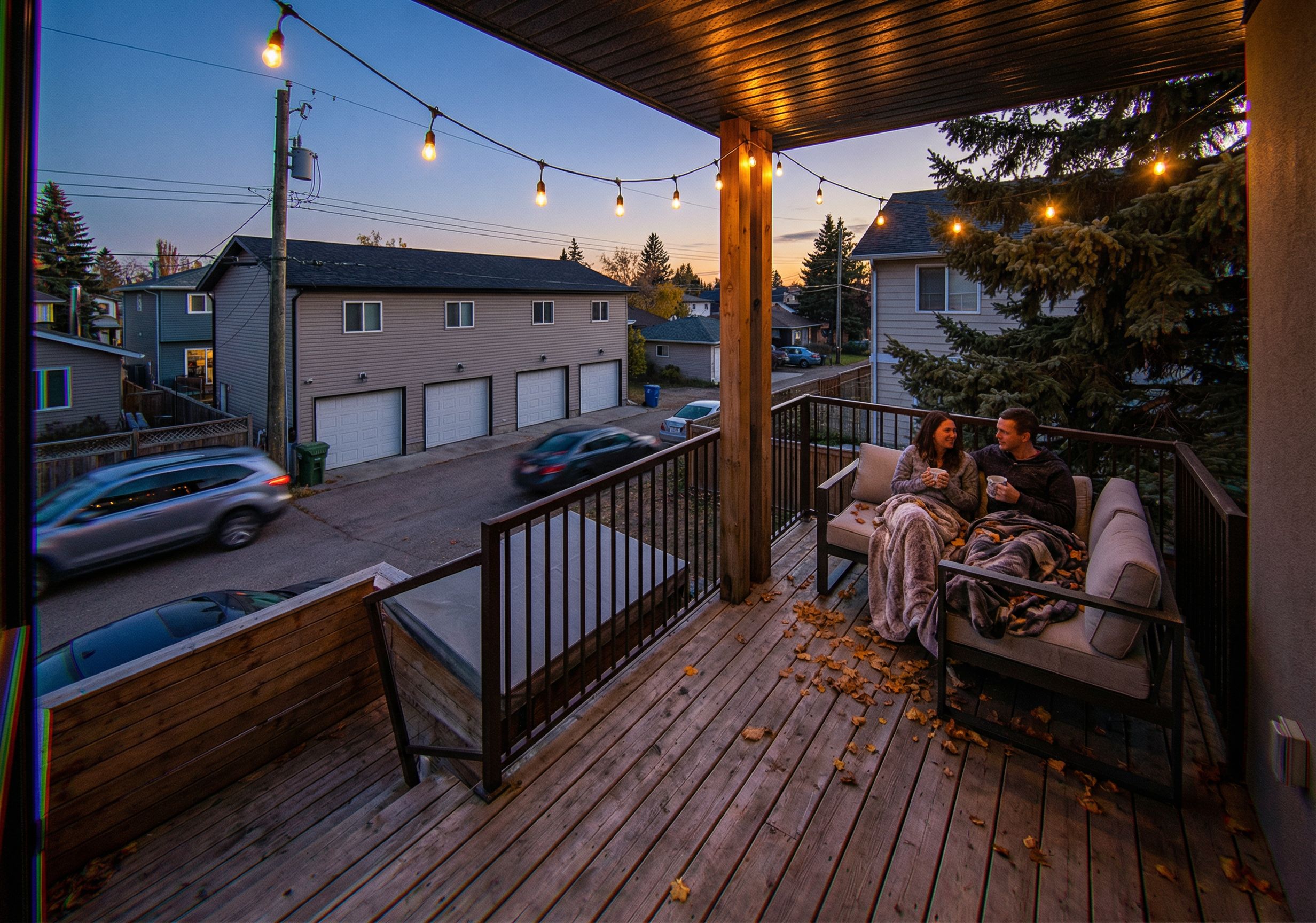 Outdoor wood roof deck overlooking lane with cars and two storey garage beyond with four overhead doors and large Scot's pine tree branches visible to right side. power pole beside existing house and houses beyond across flanking street. Double columm 3 x 3 inches, outdoor patio furniture. Fall leaves with couple sitting on deck awaiting company , keep exact camera angle