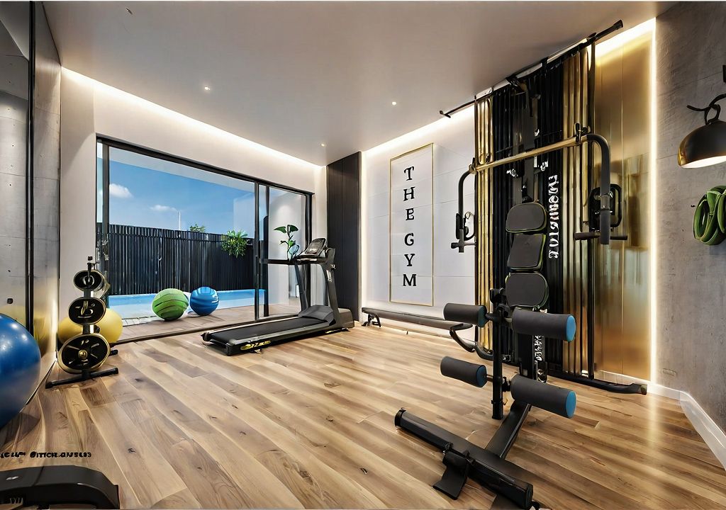 Hyper-realistic render of a compact modern home gym. Dark wooden floor, walls in black, gray, and white tones. On the back wall, a vertical white panel with a golden frame and the text “THE GYM” written vertically in black letters. On the right side, a multifunctional workout station multigym with light brown padding and black structure. On the left side, a treadmill placed near a large sliding glass door, showing an outdoor view with a white wall and blue sky. On the floor near the glass, two striped Pilates balls green and yellow. In the left corner, a rack with black weight plates neatly organized. Natural lighting coming through the glass, complemented by modern ambient lights and yellow neon details on the side walls. Minimalist, sophisticated, and realistic style with a strong contrast of colors black, white, gold, and wood. --v 6 --ar 16:9 --q 2