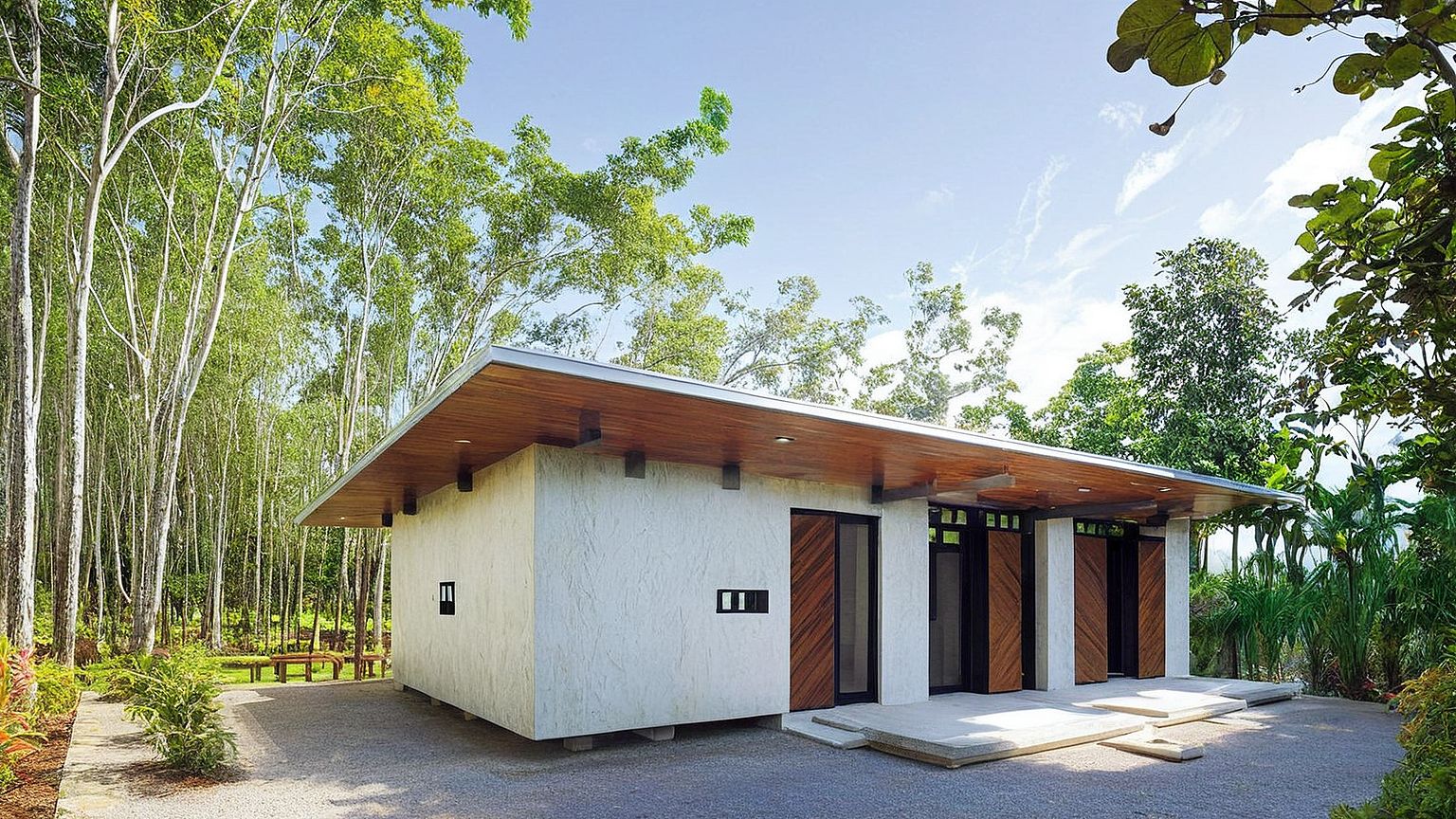 PromptPhoto of a modern single-story public toilet, featuring prominent geometric forms and a dynamic roof design. Emphasize the smooth white walls, vivid yellow accents, and expansive glass doors that invite natural light. Set in a lush garden surrounded by tropical plants, with a stone patio and subtle landscaping details. The scene is bathed in bright afternoon sunlight, casting soft shadows. Capture from a low angle with a wide lens to highlight the structure's relationship to its verdant surroundings and create an inviting atmosphere.
