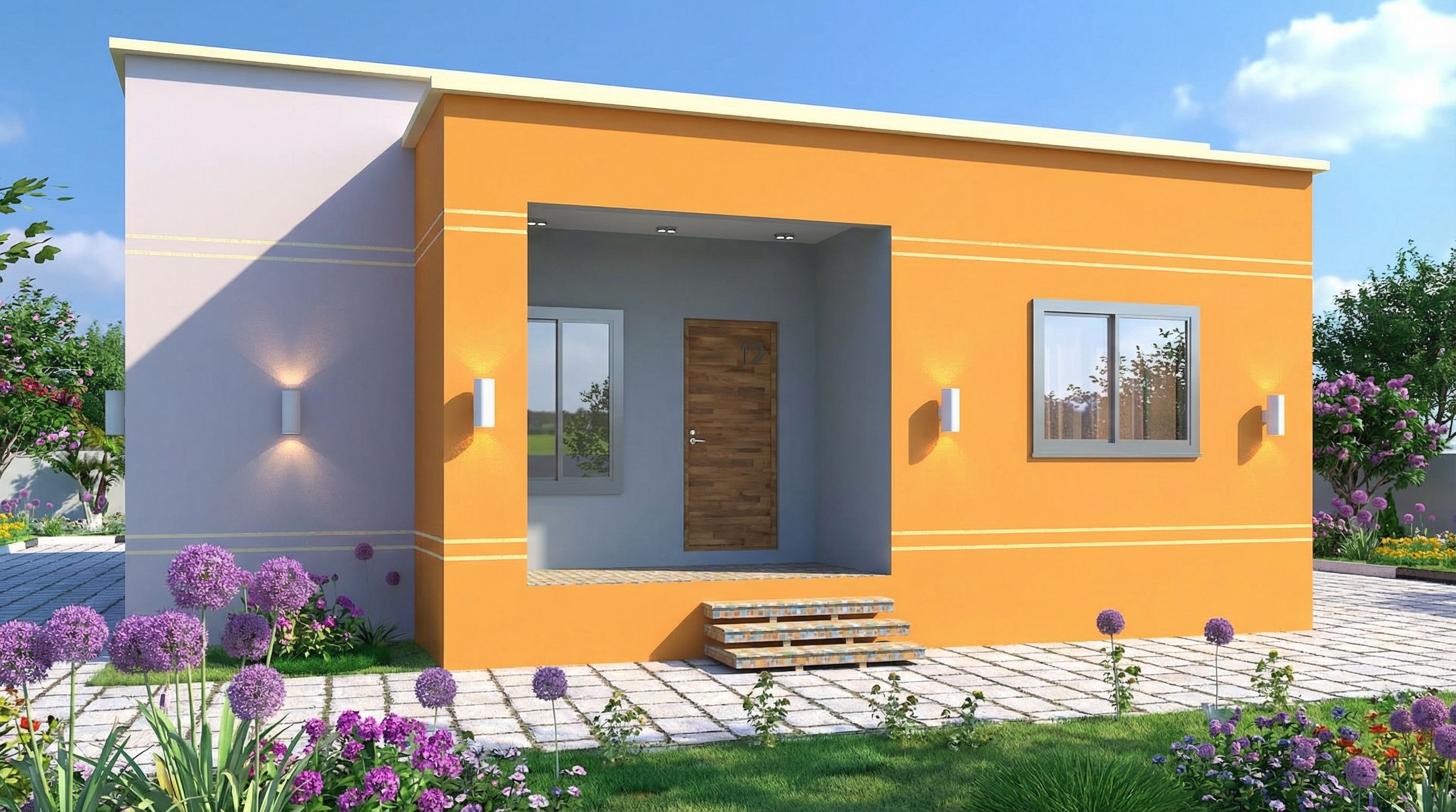 Promptarchitectural exterior rendering, render this photo into photorealistic rendering, Photo of a modern single-family house featuring a distinctive orange and pastel facade, characterized by smooth textures and clean lines. The entrance is accentuated by a wooden door and symmetrical windows, illuminated by sleek outdoor wall sconces. Surrounded by a landscaped garden with vibrant flowers, the setting enhances the lively ambiance. Bright natural daylight casts soft shadows, creating depth and warmth. Captured from a slightly low angle, emphasizing the façade and entrance, using a standard lens for clarity and balance in composition., keep exact camera angle, high quality, professional, detailed scene