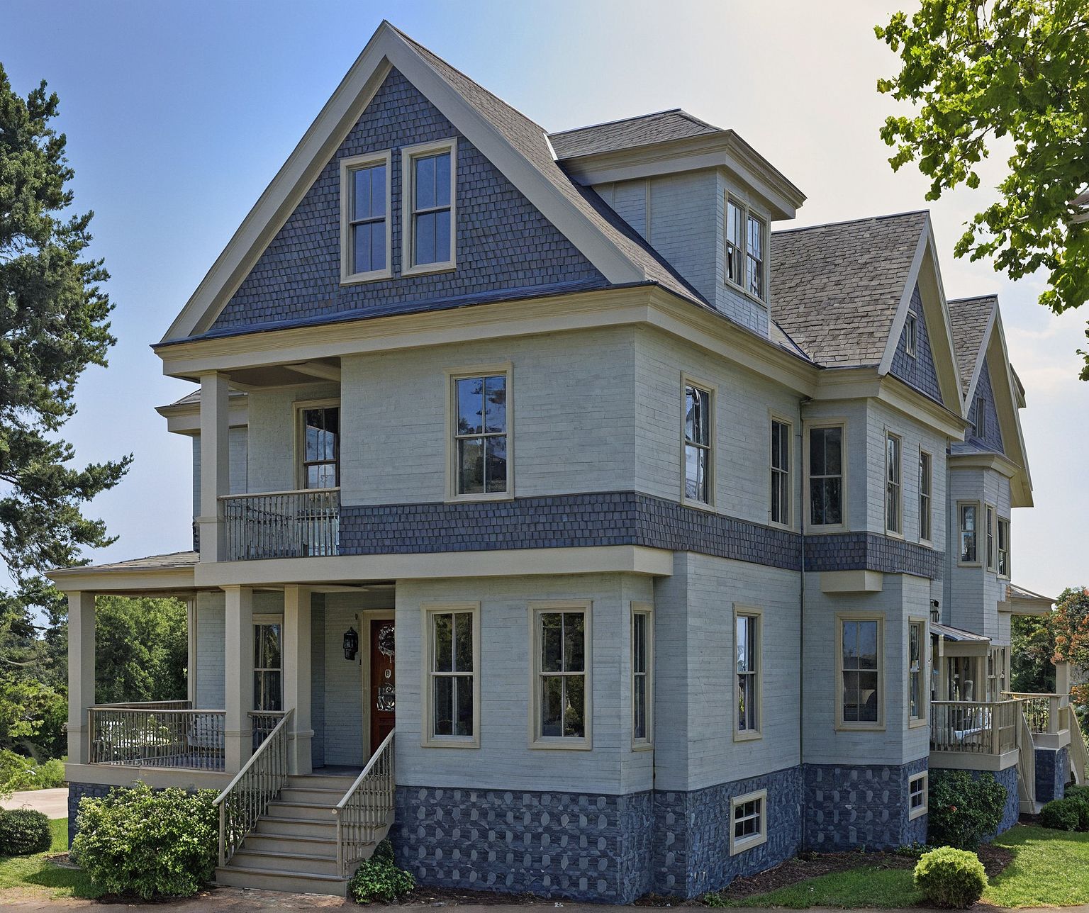 PromptRender 3D drawing of queen victorian architectural home as it is drawn exactly. Daytime with light overcast. Use the reference image for coloring of the different materials. White sliding, cream shakers and a rich blue accent color.