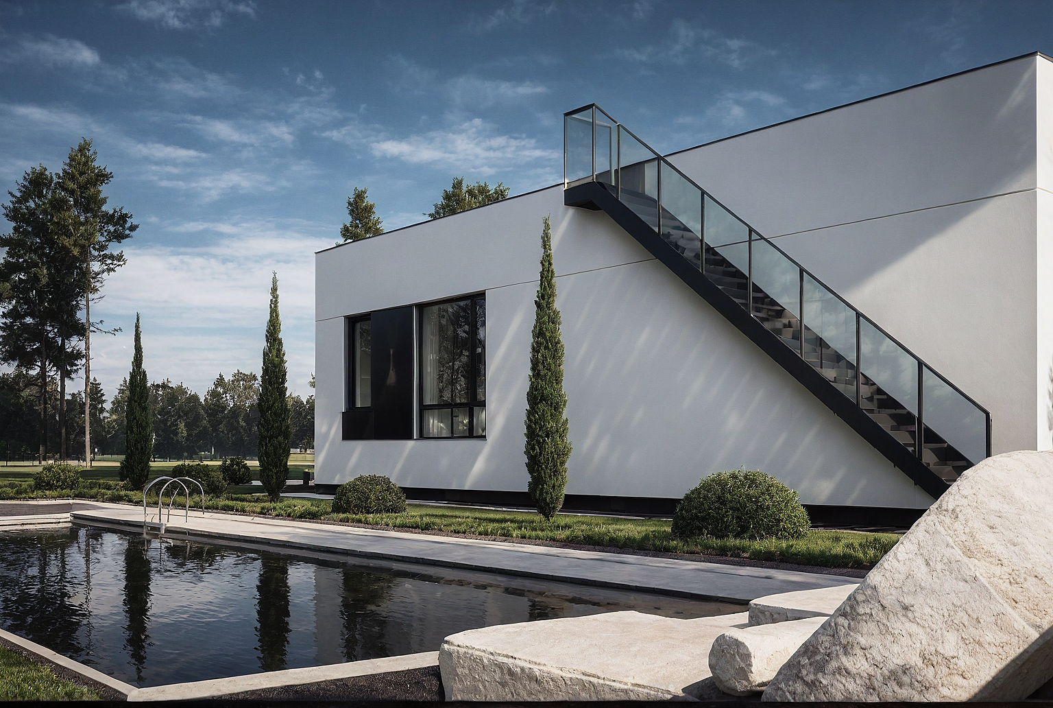 Promptvery realistic photo, sunny day, like it, beautiful surroundings, white house with dark panels