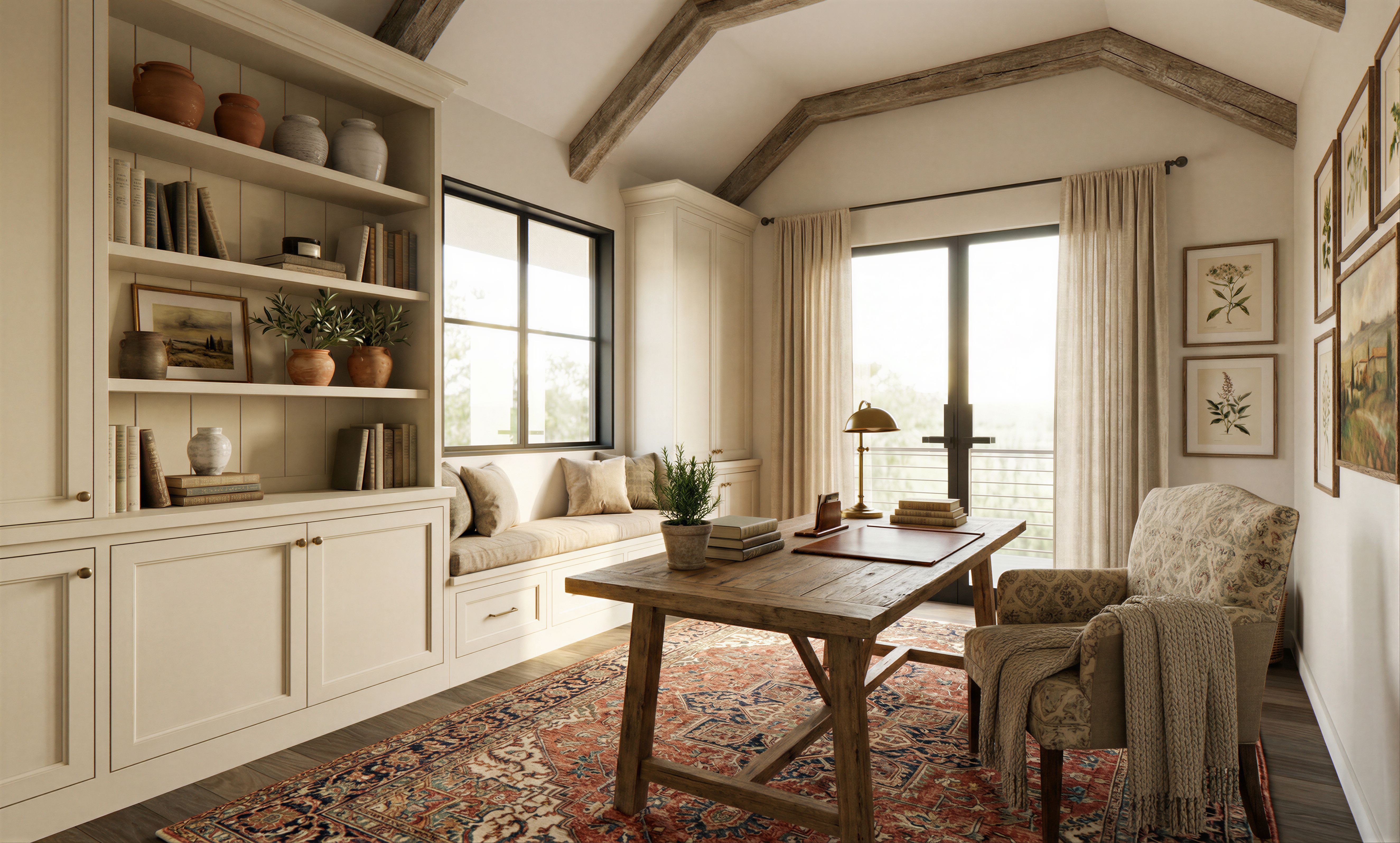 make "her" farmhouse style study room with built-ins and other items where appropriate with little Italian flavor, keep exact camera angle