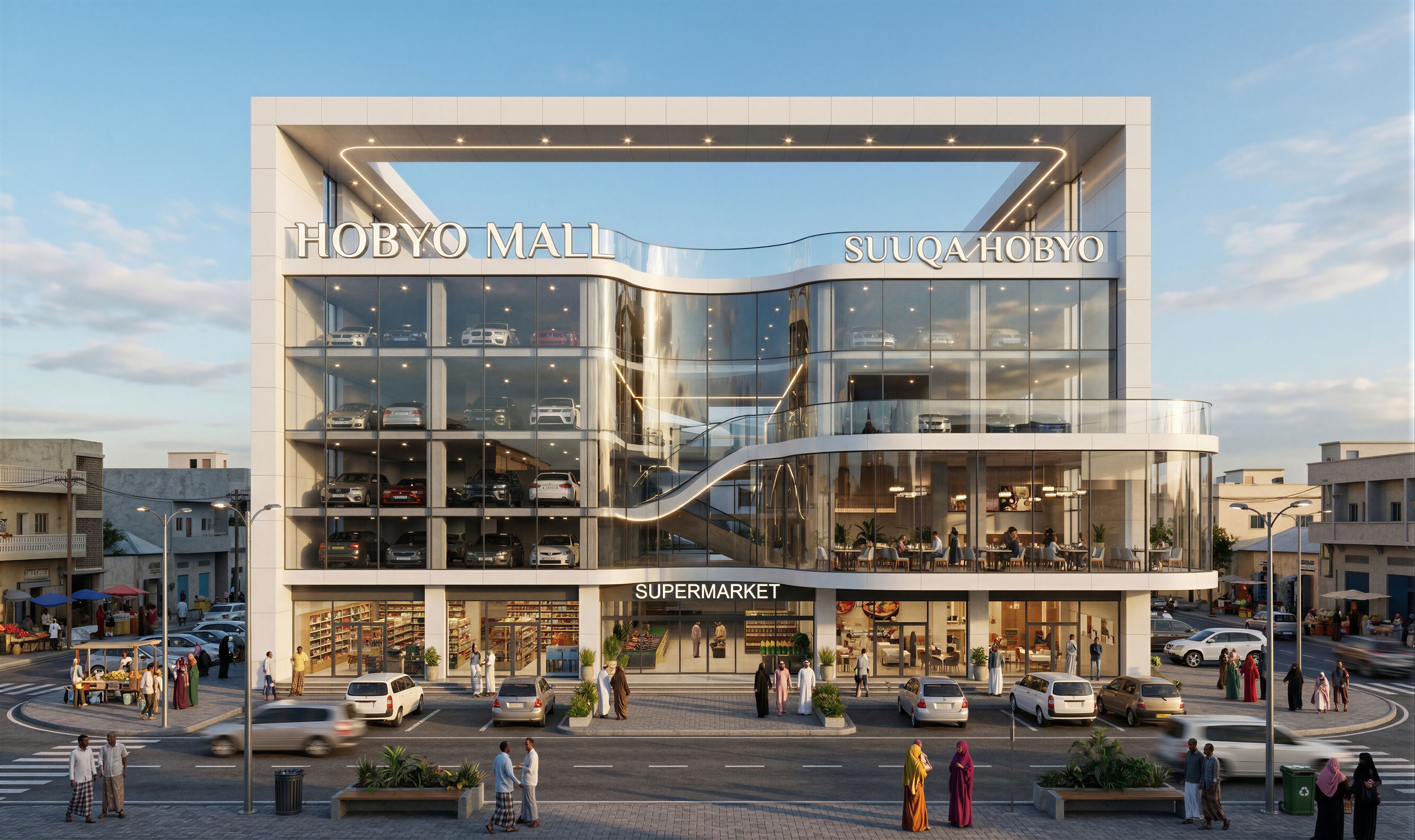 Commercial mall in Mogadishu Somalia. Make the glass realistic, transparent and reflective. Ground floor Supermarket and shops. First floor Restaurant with a balcony overlooking the road. Use white aluminium composite panels on the building . PUT PEOPLE OF SOMALI ORIGIN ON THE STREET. INCLUDE SOME SPOT LIGHTS, ROPE LIGHT AND STREET LIGHTS ON THE BUILDING. MAKE IMAGE HIGH RESOLUTION 8K. PUT NAME "HOBYO MALL" ON THE BUILDING. MAKE THE CURTAIN WALLING URVED AS IN THE ORIGINAL DESIGN AND INCLUDE RESTAURANT ON FIRST FLOOR WITH A GLASS BALCONY OVERLOOKING THE ROAD. MAINTAIN ORIGINAL DESIGN WITH THE CURVED CURTAIN WALLING ON THE FACADE., keep exact camera angle