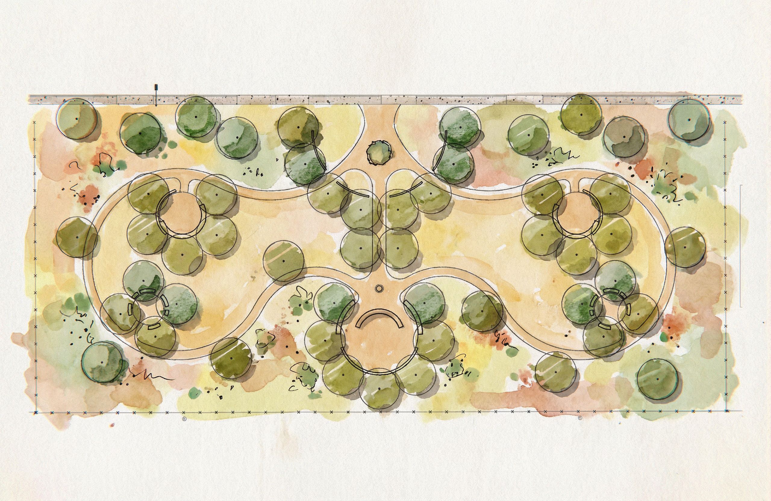 Take this CAD linework and create an accurate but hand drawn illustrative plan that renders the circles with dots as trees the bold circles as gathering spaces path as stabilized dg. this should have a xeric landscape feel that keeps budget minimal for shrubs and but in a loose generic watercolor style renders the open space as a desert colored dg.