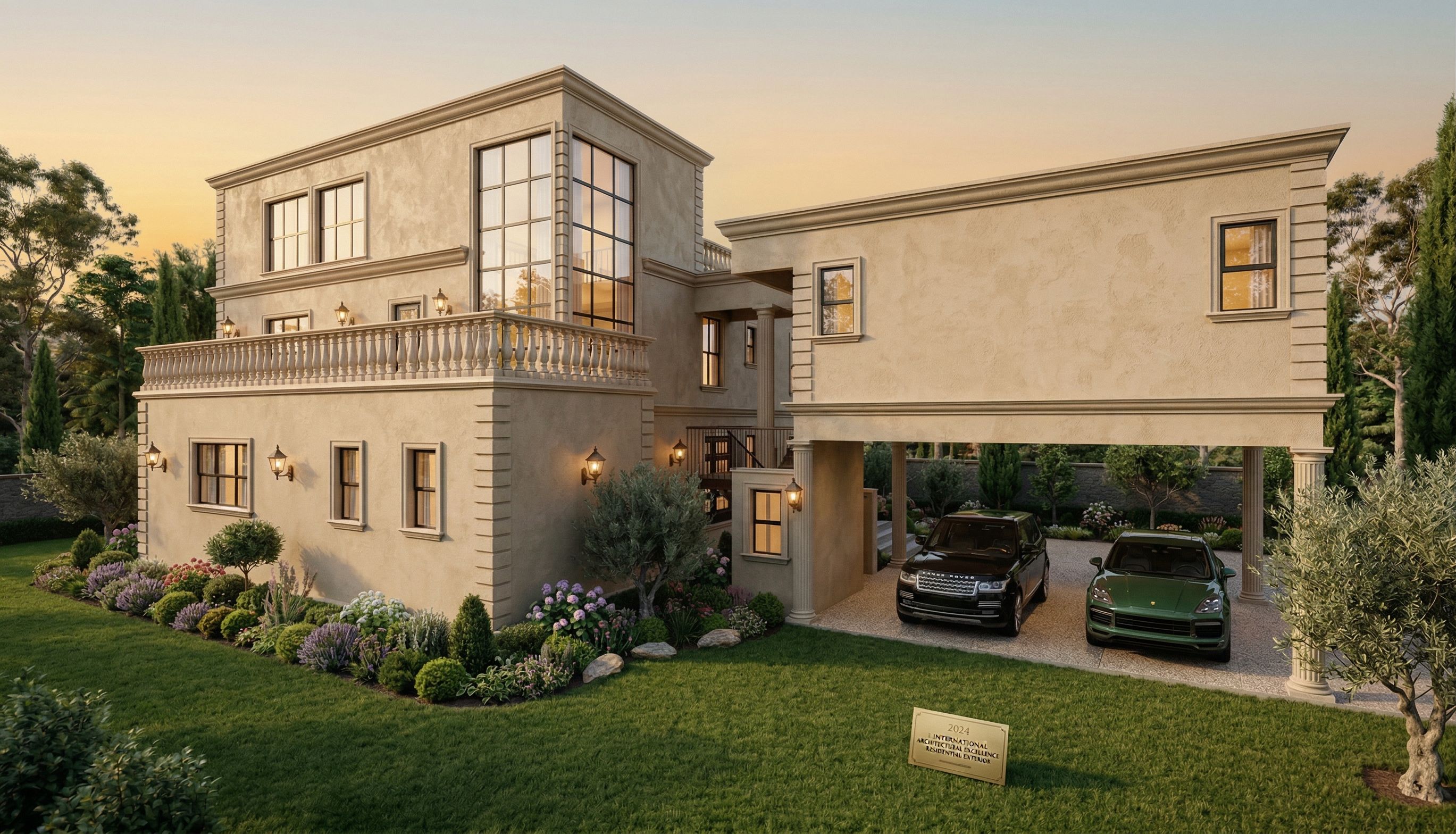 Transform this render into a realistic image with textured beige walls and premium cars in the car port, keep exact camera angle, keep exact camera angle