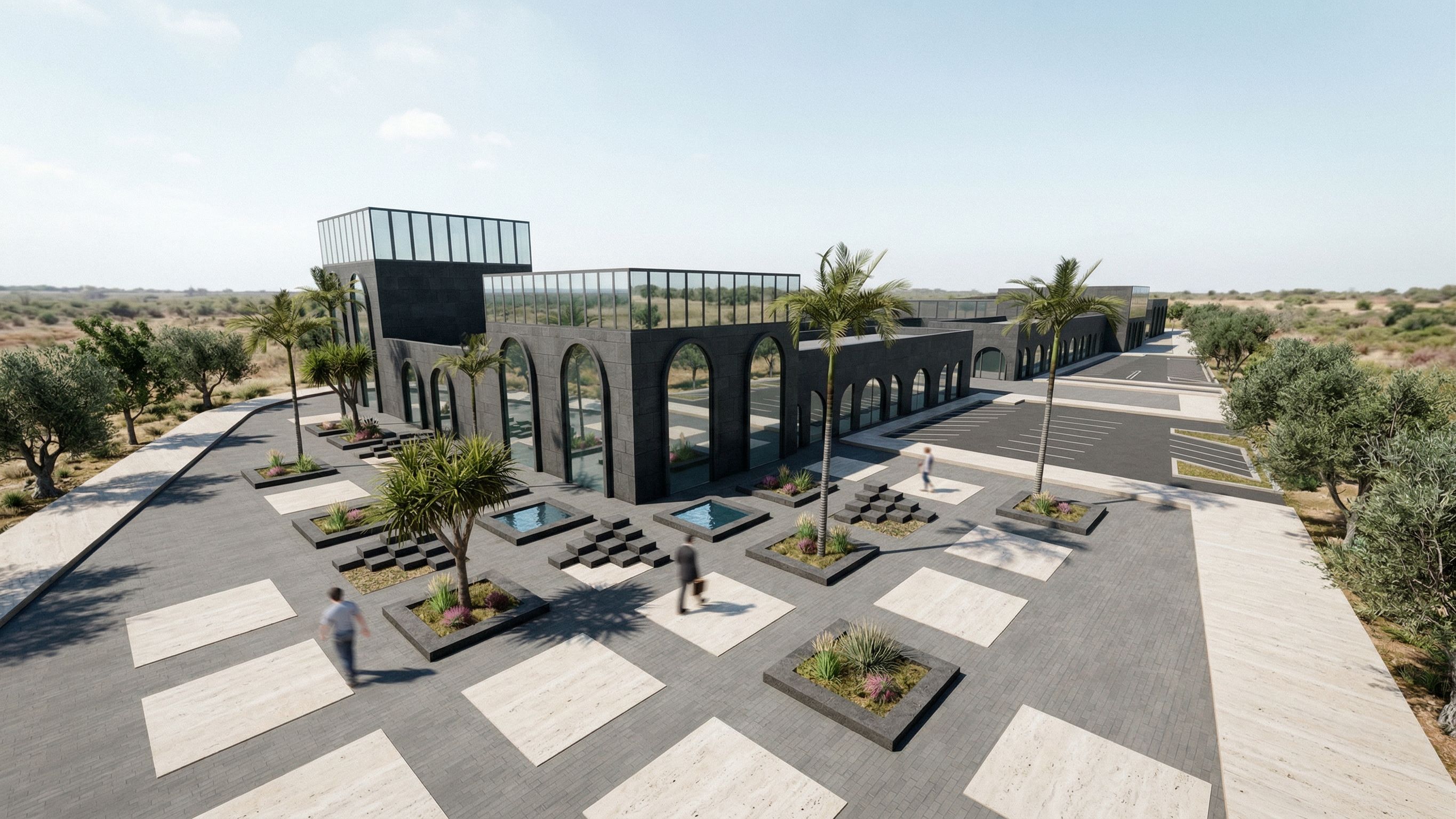 Apply realistic materials: clean modern glass facades with subtle reflections and natural stone cladding with fine texture detail.
