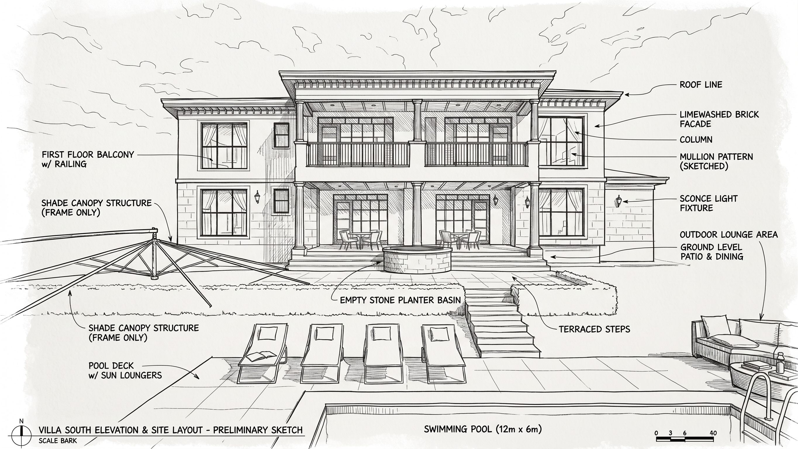 PromptTurn this render into a black and white sketch with annotations and without plants, keep exact camera angle