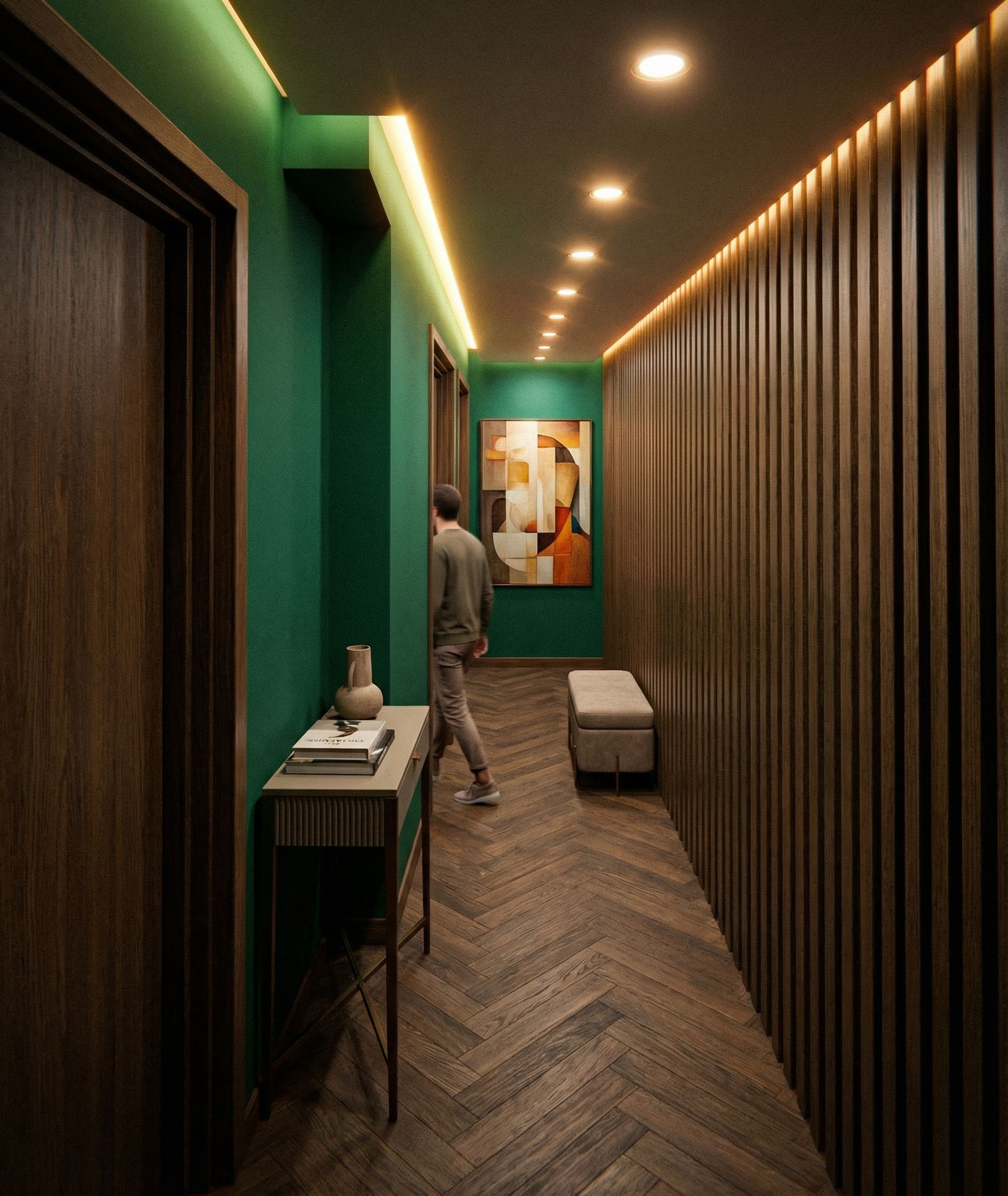 dont change the angle or the furniture i want the lamellen on the right side out of dark oak. and the walls out of emeral green. add a nice rectangular painting on the back wall. on the ceiling there are circular opennings for led lights and on the long sides there are horizontal led lights to illuminate the walls. i want darker parkett floorings and make the lights warm, keep exact camera angle