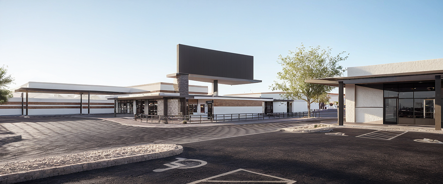Architectural visualization of a strip mall, Sunnyslope, Phoenix, Arizona, clear sunny day, stone paver, white plaster, block wall,