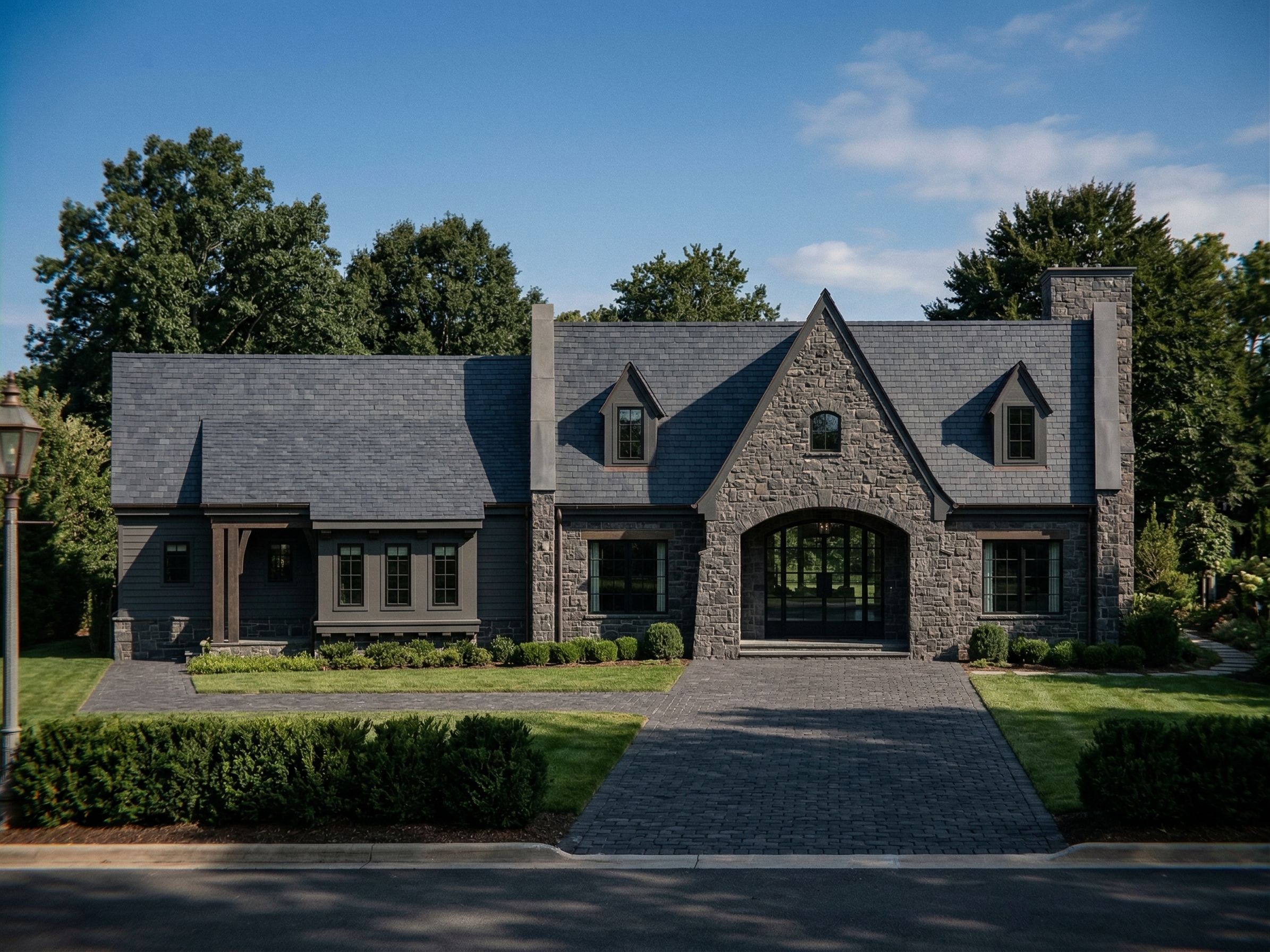 Render this modern european cottage residence. Mid morning lighting. Established neighborhood. dark tones. Mix of stone veneer, horizontal siding, wainscoting. , keep exact camera angle