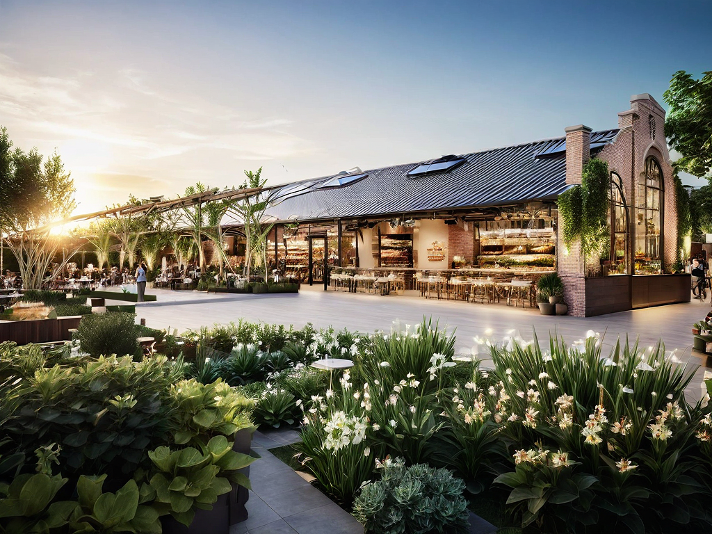 food hall, amazing garden, same construction materials, same facade style, amazing terrace, lifestyle, sunset, uranus