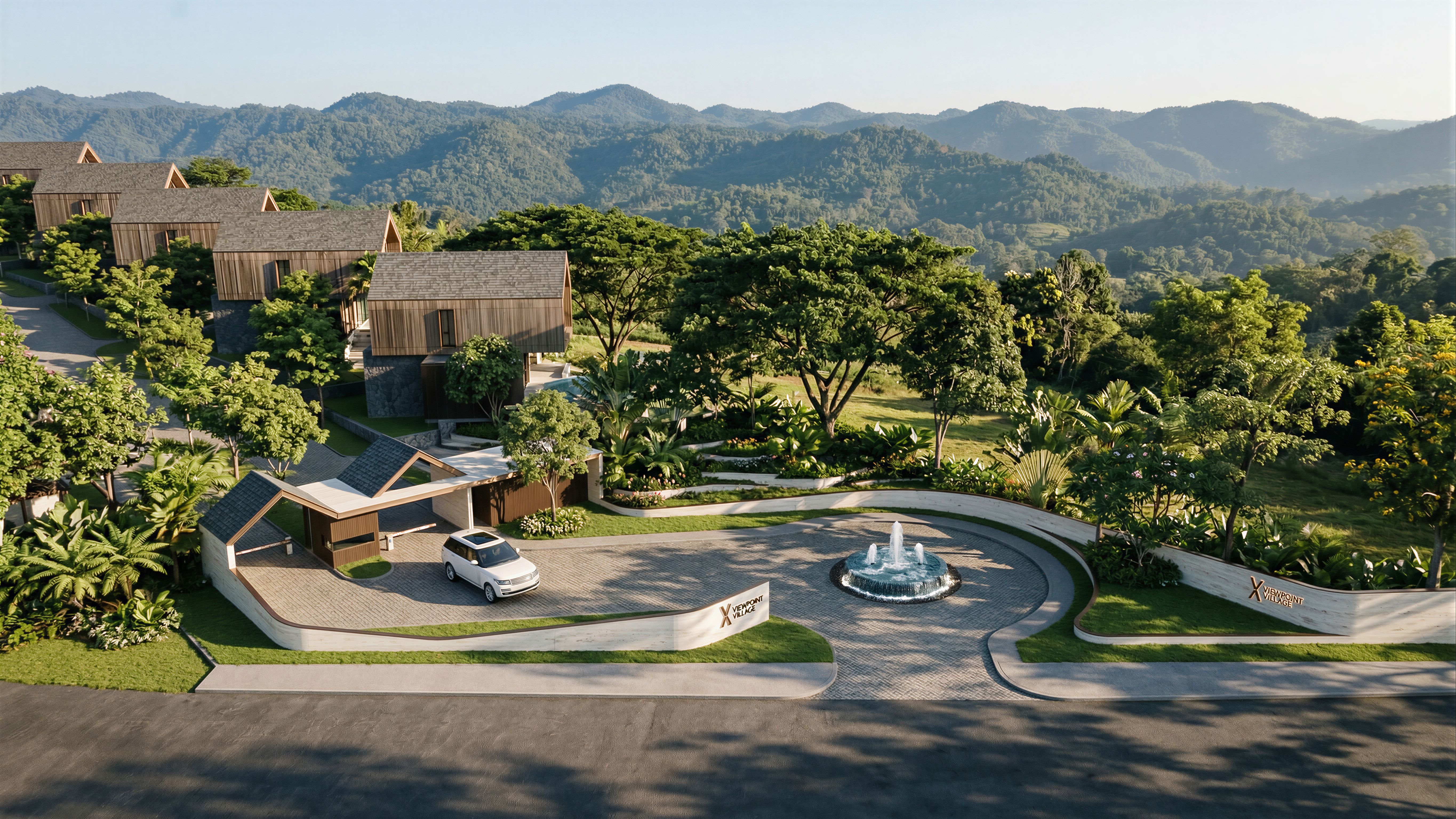 PromptA photorealistic architectural rendering of an ultra-luxury village entrance gateway and signage located in Khao Yai, Thailand. The design follows the composition and perspective of the reference image, featuring a Luxury Minimal style. The gateway structure is defined by striking White Travertine stone walls and rich Bronze metal accents. Raking morning sunlight grazes across the wall surfaces, casting beautiful, intricate dappled shadows of trees onto the curved stone façade. The project name and logo, made of Bronze, are elegantly mounted on the entrance wall. The gateway features a prominent gable-shaped roof with dark gray asphalt shingle roofing. The surrounding environment is lush and shady, filled with large mature trees and diverse tropical flora, with leaves glistening in the morning light. A scenic view of the surrounding Khao Yai mountain ranges forms the background. High-resolution, cinematic lighting, incredibly detailed., keep exact camera angle