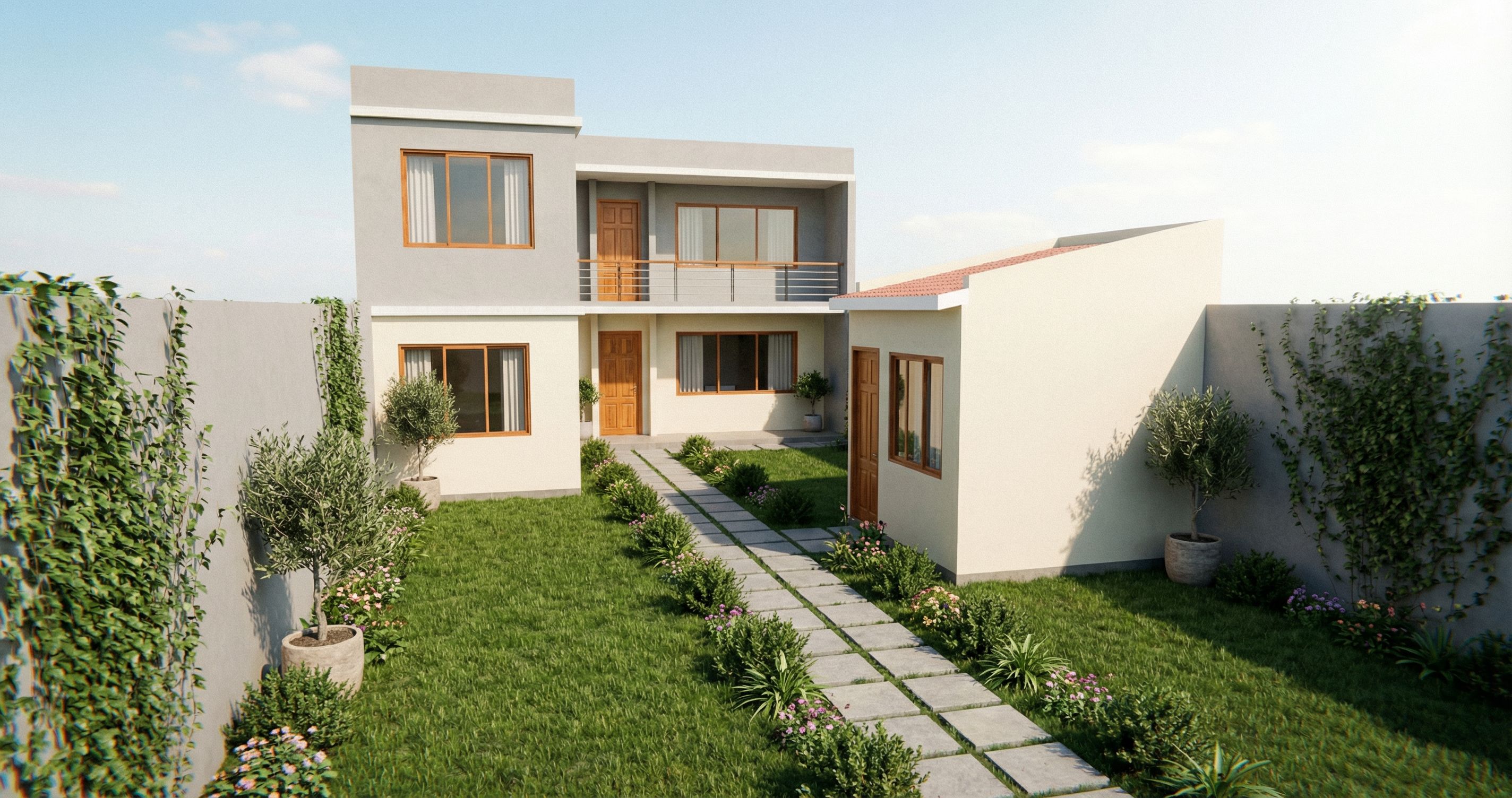 PromptPhoto of a modern residential complex featuring two distinct buildings with smooth facades and wooden door accents. Landscaping includes a neatly paved pathway and lush green grass. Natural daylight illuminates the scene, casting soft shadows and highlights on the structures. Captured from a slightly elevated angle, focusing on the balance between the buildings and their surroundings, with a wide-angle lens to enhance the spatial depth and context within the urban environment., keep exact camera angle