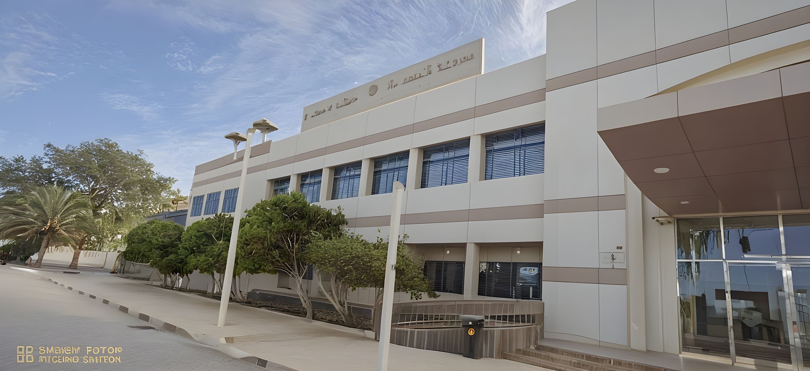 PromptPhoto of a modern educational building with clean lines and a combination of concrete and glass materials, showcasing symmetrical windows and a well-defined entrance. Surrounded by landscaped greenery and palm trees, the urban context features well-maintained pavements and adjacent structures. Bright natural light highlights the façade, casting gentle shadows in the morning sun. Captured from a slightly low angle, the perspective emphasizes architectural details and the sense of scale, using a wide-angle lens to encompass the surrounding environment.