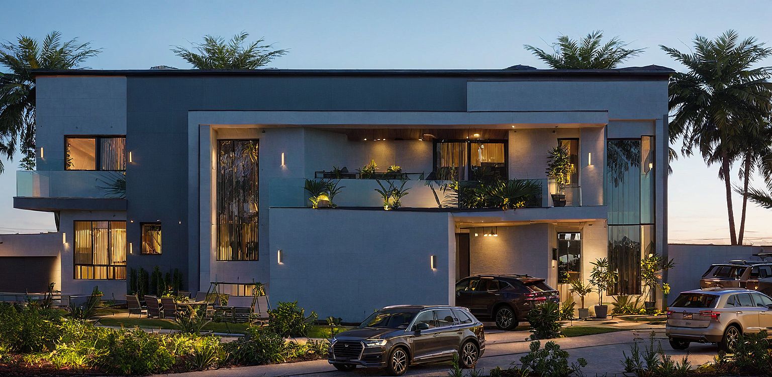 PromptPhoto of a contemporary two-story residential building, featuring a sleek facade with a mix of textured concrete and bold color blocks. The design incorporates large glass windows, lush landscaping with tropical plants, and an outdoor seating area. Surrounded by a suburban environment, with parked cars and flowering shrubs. Captured at dusk, the warm artificial lighting accentuates the architectural details while creating soft shadows. The camera angle is slightly elevated, providing a dynamic view of the structure and its inviting front yard.