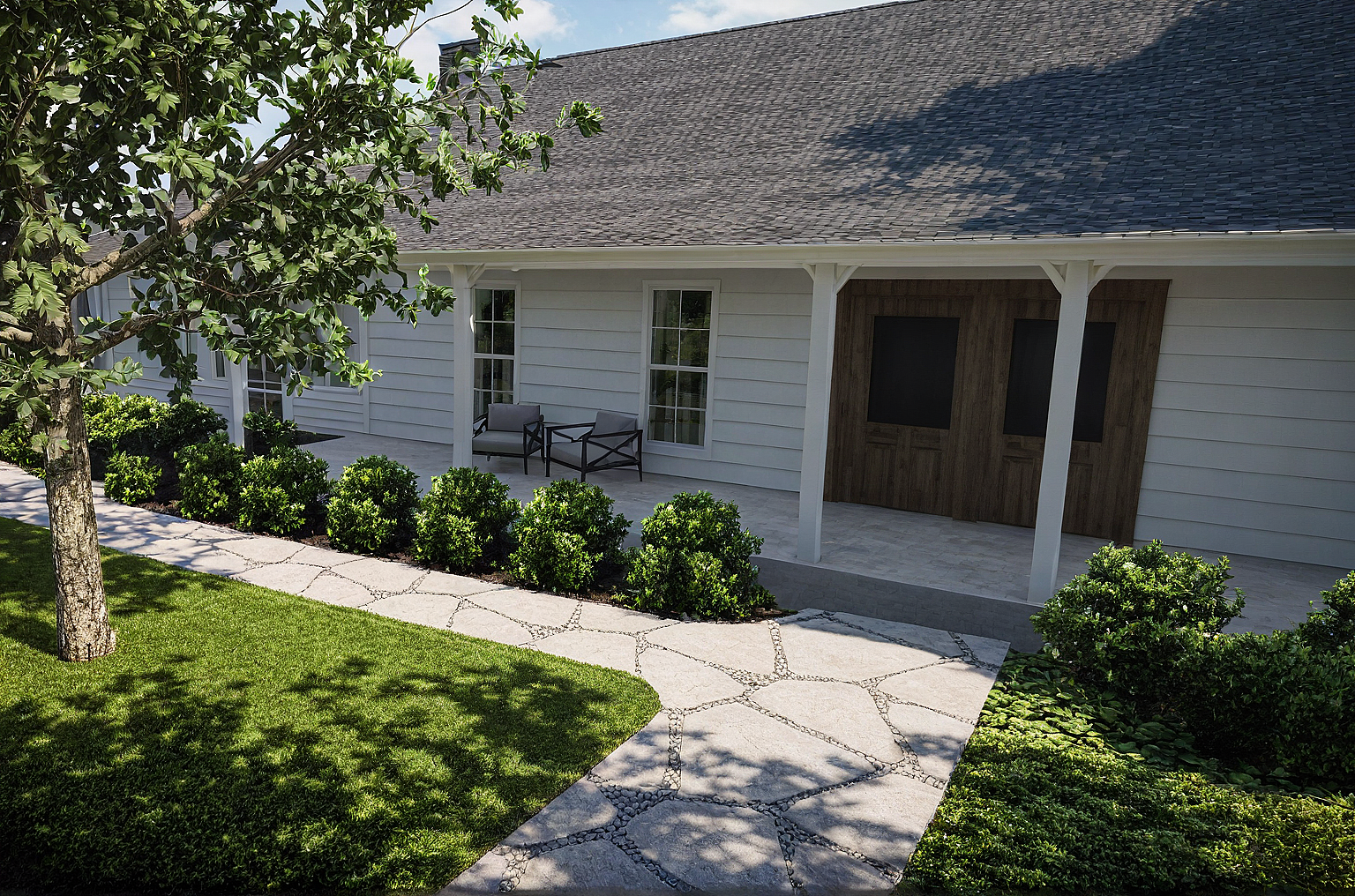 enhance, photo realistic, boxwoods, limelight hydrangeas