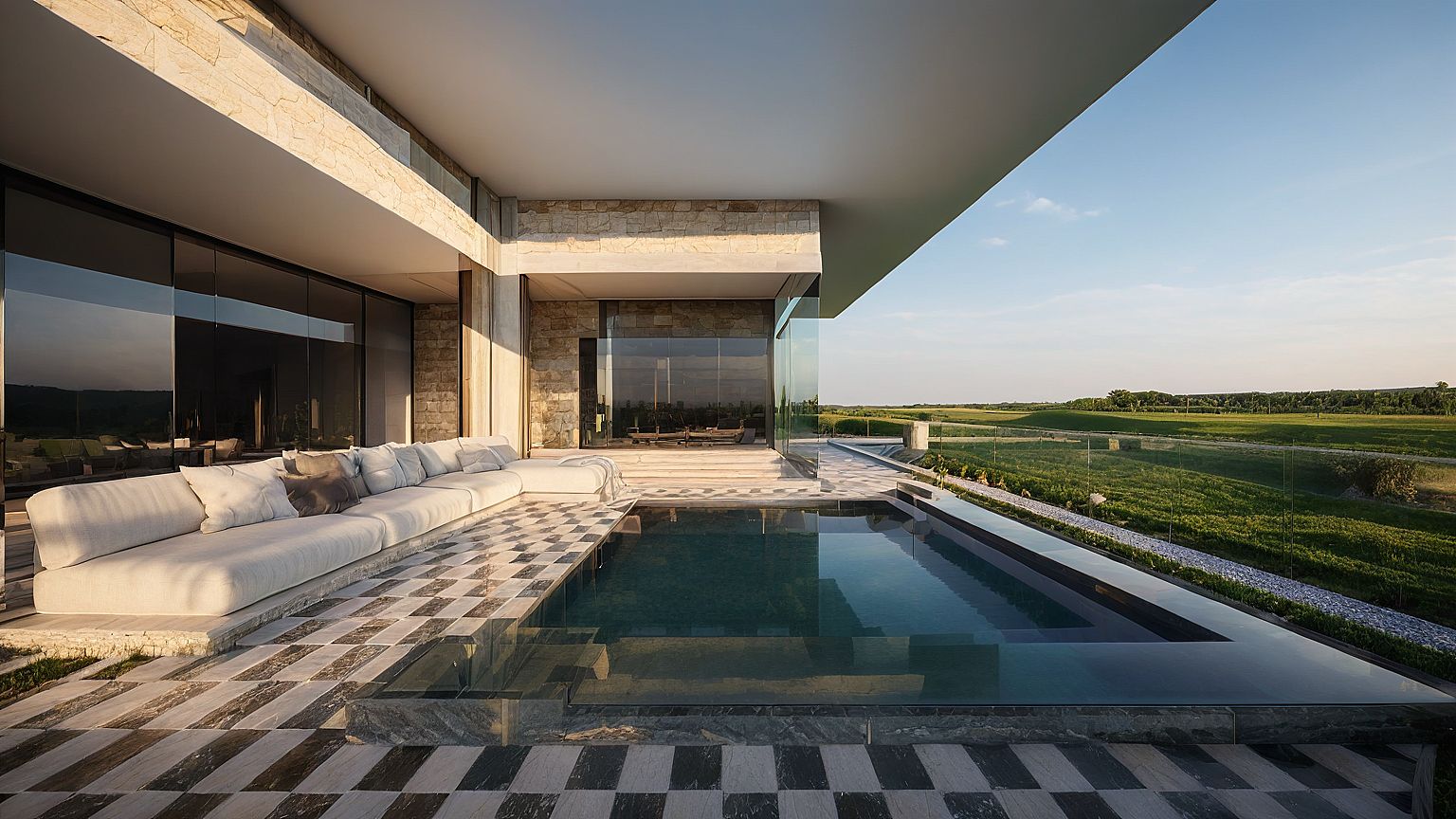 Photo of a modern villa, characterized by large glass panels and stone accents, featuring an elegant terrace with a pool. Emphasize the smooth textures of the glass and natural stones, along with the unique checkerboard pattern of the flooring. Set in a serene countryside backdrop with lush green fields. Highlight golden hour lighting, casting warm reflections on the glass surfaces, creating gentle shadows. Capture a wide-angle view from a low perspective to showcase the villa's openness and connection to the landscape, utilizing a 24mm lens for a dynamic composition.