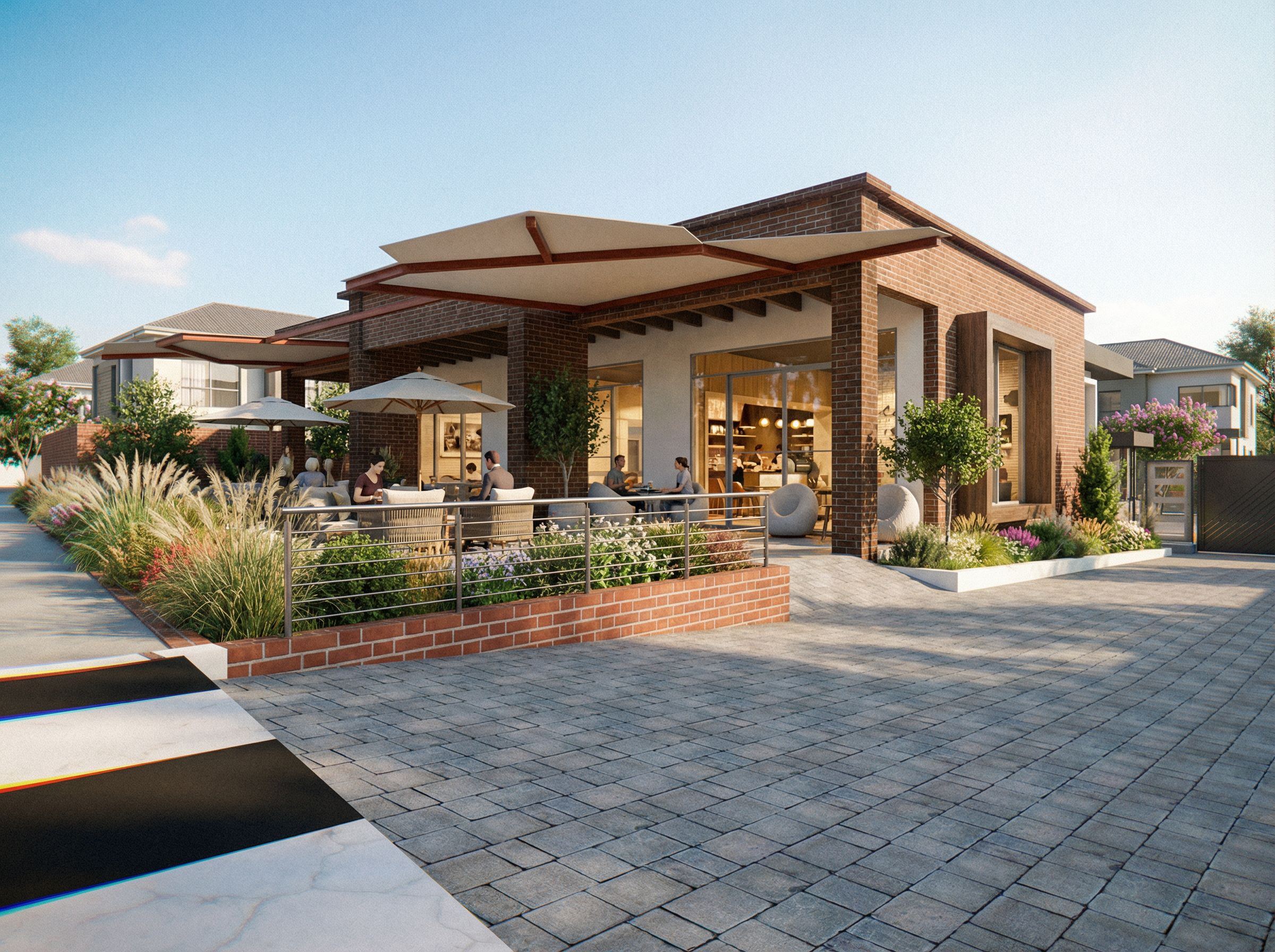 modern rstuarant and cofee shope in ahigh scale residential neighbourhood,Natural vegetation ,lighting,high resolution.mantain the finishes provided, keep exact camera angle