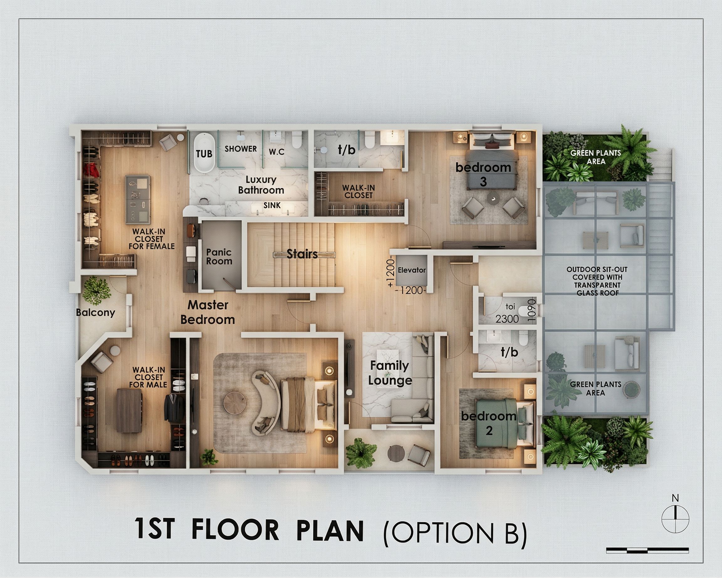 Generate a high-resolution 2D top-view rendered floor plan of a modern luxury residential first floor based on an architectural layout. The layout should include: master bedroom with separate walk-in closets male and female, luxury bathroom bathtub, shower, WC, double sink, balcony, family lounge, bedroom 2, bedroom 3, multiple bathrooms t/b, central staircase, elevator, panic room, outdoor sit-out with transparent glass roof, and green plant areas. Style: luxury modern, elegant, warm, minimalistic design. Apply materials: Light wood flooring in bedrooms and family lounge Marble or porcelain tiles in bathrooms Neutral wall tones white, cream, soft grey Include: Fully furnished spaces beds, lounge seating, wardrobes, bathroom fittings Detailed walk-in closets male & female sections with shelving and hanging units Clear wall thickness, door swings, and window placements Soft ambient lighting and shadows for depth Clean top-down orthographic view no perspective Minimal, stylish room labels Enhance with lifestyle elements: Indoor decor rugs, plants, artwork Balcony seating arrangement Outdoor sit-out with transparent glass roofing effect and greenery Final output should look like a premium architectural presentation board, sharp, realistic, and professionally styled., keep exact camera angle