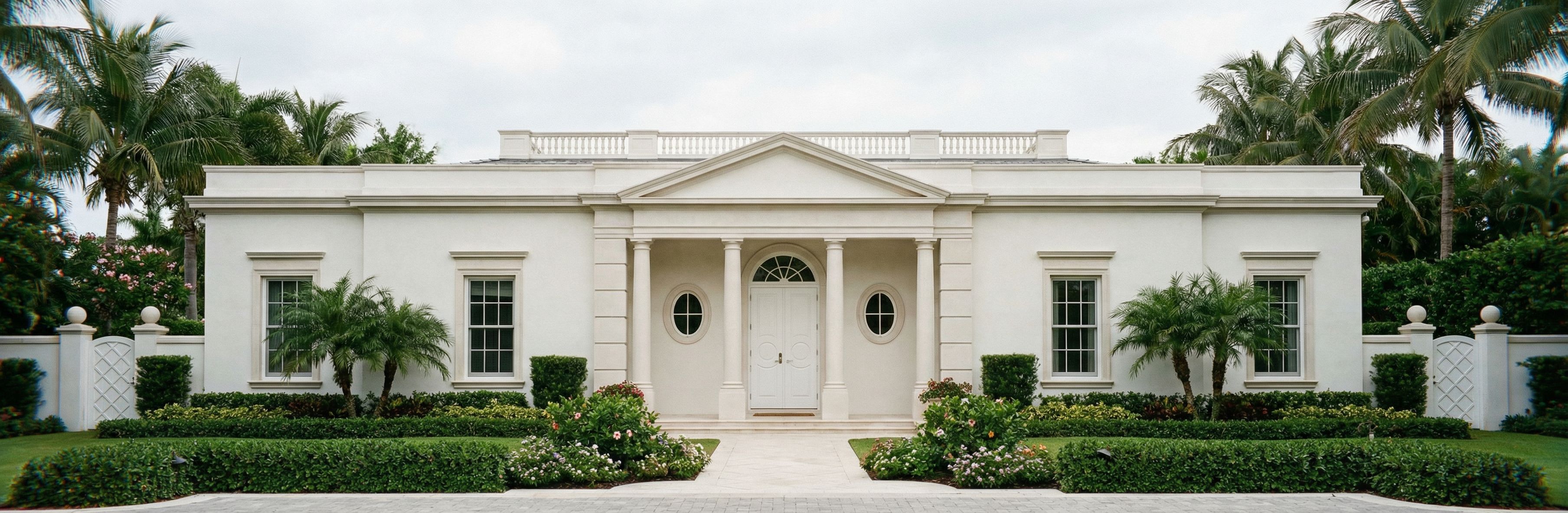 Ultra-photorealistic architectural exterior render of a Regency / Neo-Palladian style residence with strict symmetry and equal proportions throughout the massing. Facade is classically ordered, balanced, and restrained, emphasizing harmony and hierarchy rather than ornament. The building features a covered portico with classical proportions, 6 feet in depth, projecting 2 feet beyond the most forward wall, centered on the primary elevation. Portico scale is refined and historically appropriate, neither oversized nor shallow. Exterior material is smooth white stucco with subtle natural variation and realistic surface texture. The front door should be white. slight variations in shades of white on the architectural elements that you would see naturally in a real life on a home. Openings are perfectly aligned vertically and horizontally, with consistent rhythm and proportion. No warped geometry, no exaggerated depths. Corners are sharp but realistic, with soft edge breaks. Soft natural daylight, lightly overcast or early afternoon sun, realistic global illumination, true shadows, and balanced exposure. Camera positioned at human eye level, straight-on elevation view, 35–45mm lens, professional architectural photography composition. Strictly classical proportions; no contemporary simplifications. Quiet, disciplined composition with emphasis on proportion over ornament. Elevation accurately follows the provided sketch and architectural intent. Glass is clear and realistic with subtle reflections and interior depth—never flat or glossy. Render quality comparable to high-end architectural photography, photorealistic, refined, and timeless. No stylization, keep exact camera angle This is the front of the house and it is located in Palm Beach Florida. Using the provided elevation draw create a front on render based on the architectural elements depicted. do not add or remove anything. this is a one story building , keep exact camera angle
