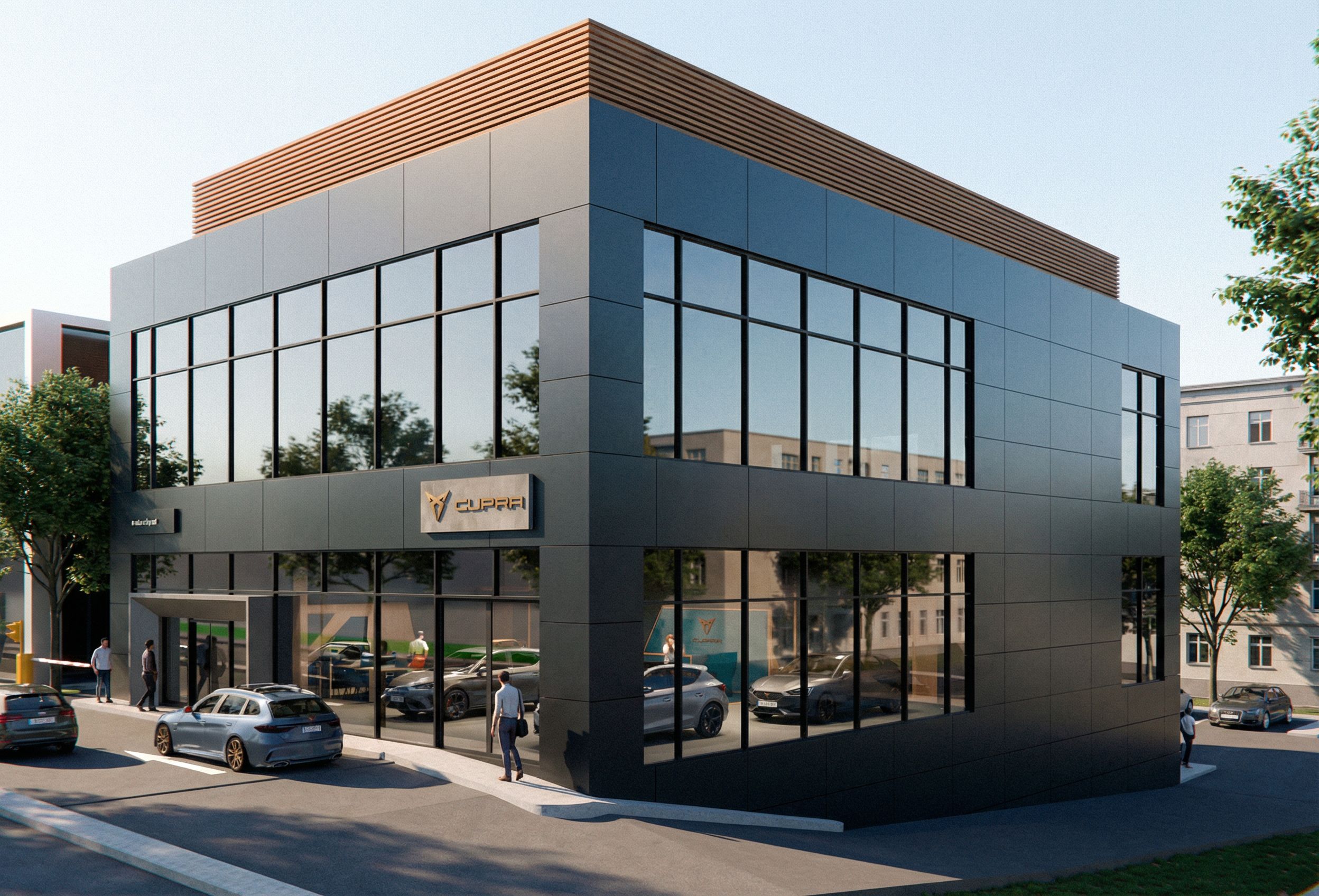 PromptA photo of a modern commercial building featuring a sleek glass and metal façade with strong architectural lines. The ground floor of the building houses a CUPRA car showroom, with large glass windows displaying the cars inside and reflecting natural light. The design is complemented by a wooden slatted roof detail that adds warmth to the contemporary structure. The building is set in an urban environment surrounded by nearby buildings, while soft afternoon sunlight bathes the scene, creating gentle shadows and highlighting the façade details. The photo is captured from a slightly low angle to emphasize the building’s height and grandeur, using a 70 mm lens to provide a balanced view that showcases both the building and its surroundings., keep exact camera angle