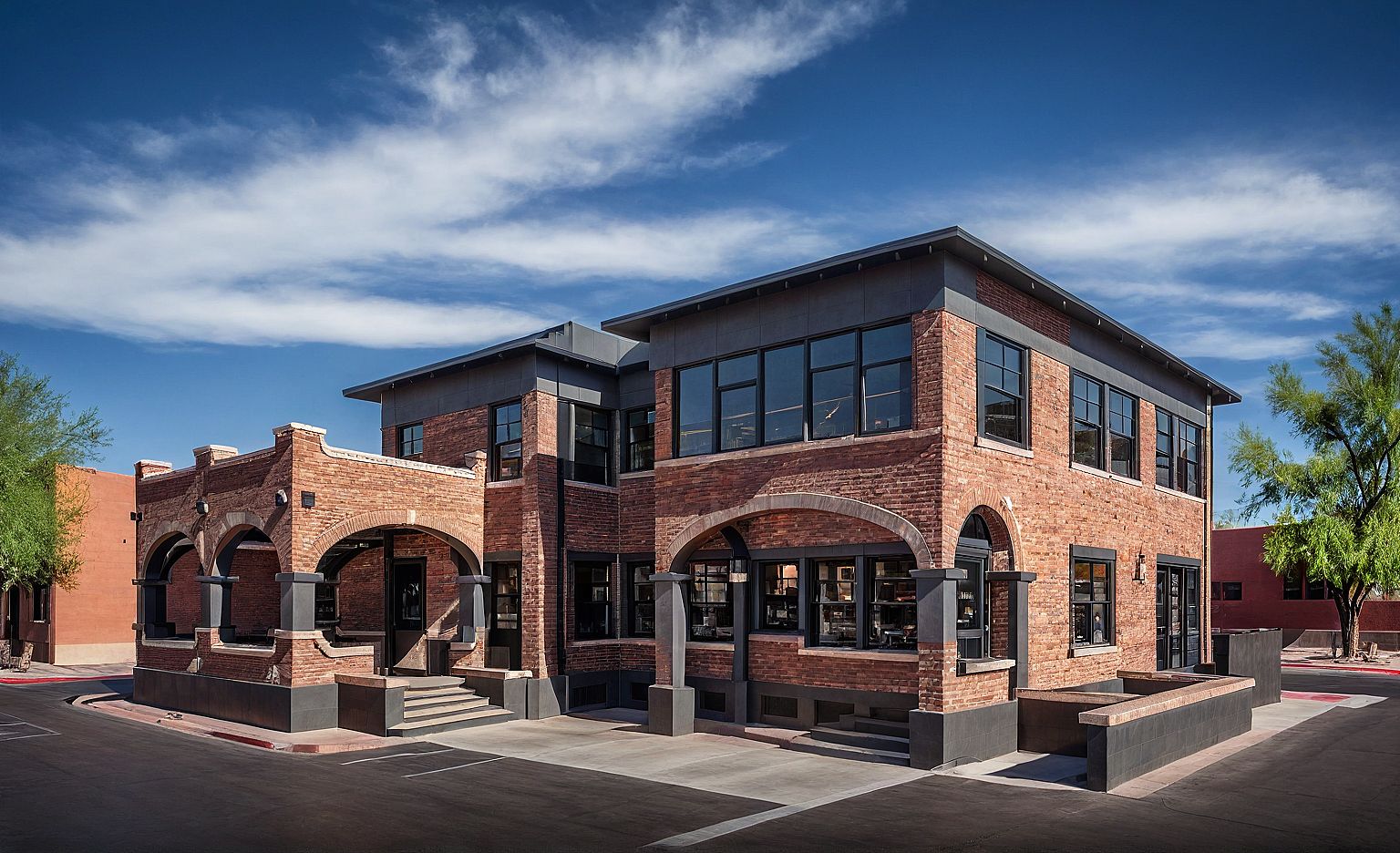 PromptModern restaurant in downtown Phoenix, Arizona, historical neighborhood, exposed brick facade, uniform color, dark gray foundation.