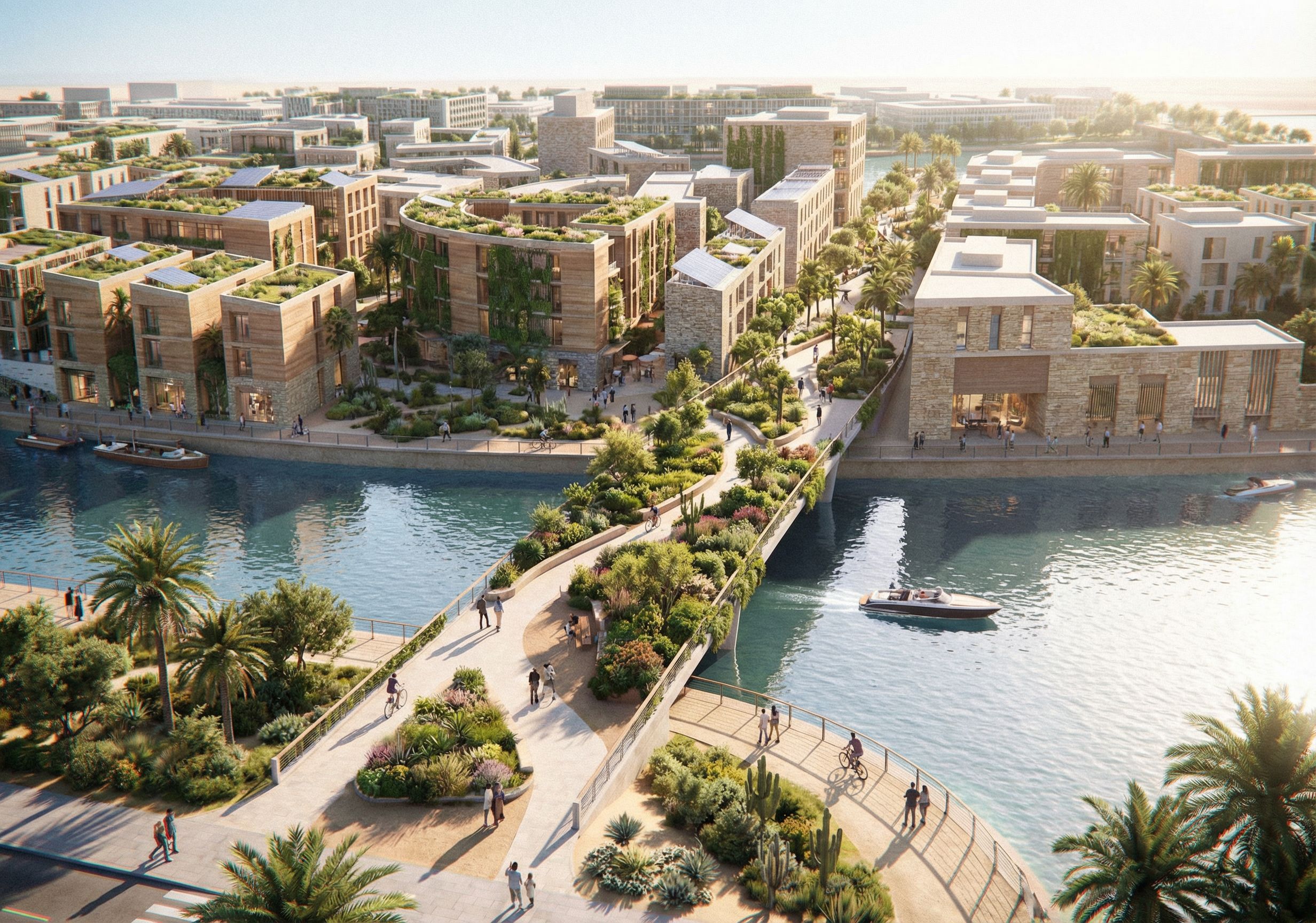 innovation district, with indigenous sustainable mixed use buildings and landscaped bridge pedestrian parks, in Bahrain. circular economy