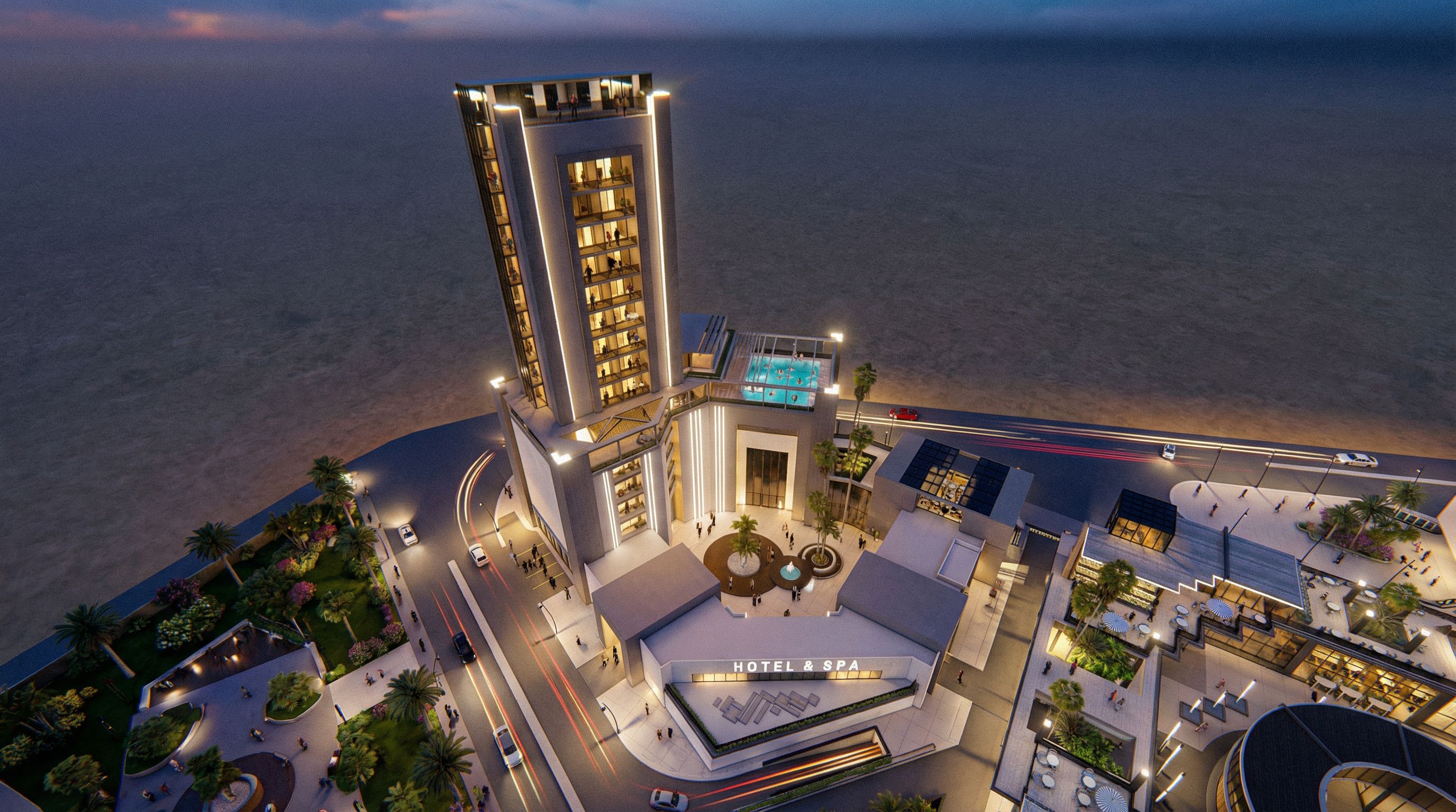 this is a hotel and pool and spa center .. make this scene alive add people on the balconys of the hotel and the people swimming in the poo and the people interacting on the roof tops cafeterias add pedestrians and cars to the streets moving with light effect of the speed make the scene super realistic, keep exact camera angle