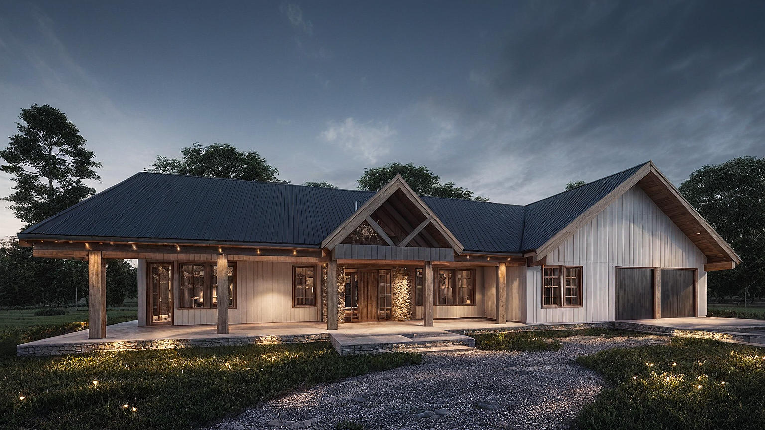 Promptfarm house . white vertical siding , light grey wood structure. wood beans. stone floor. INTERNAL LIGHTS . EVENING