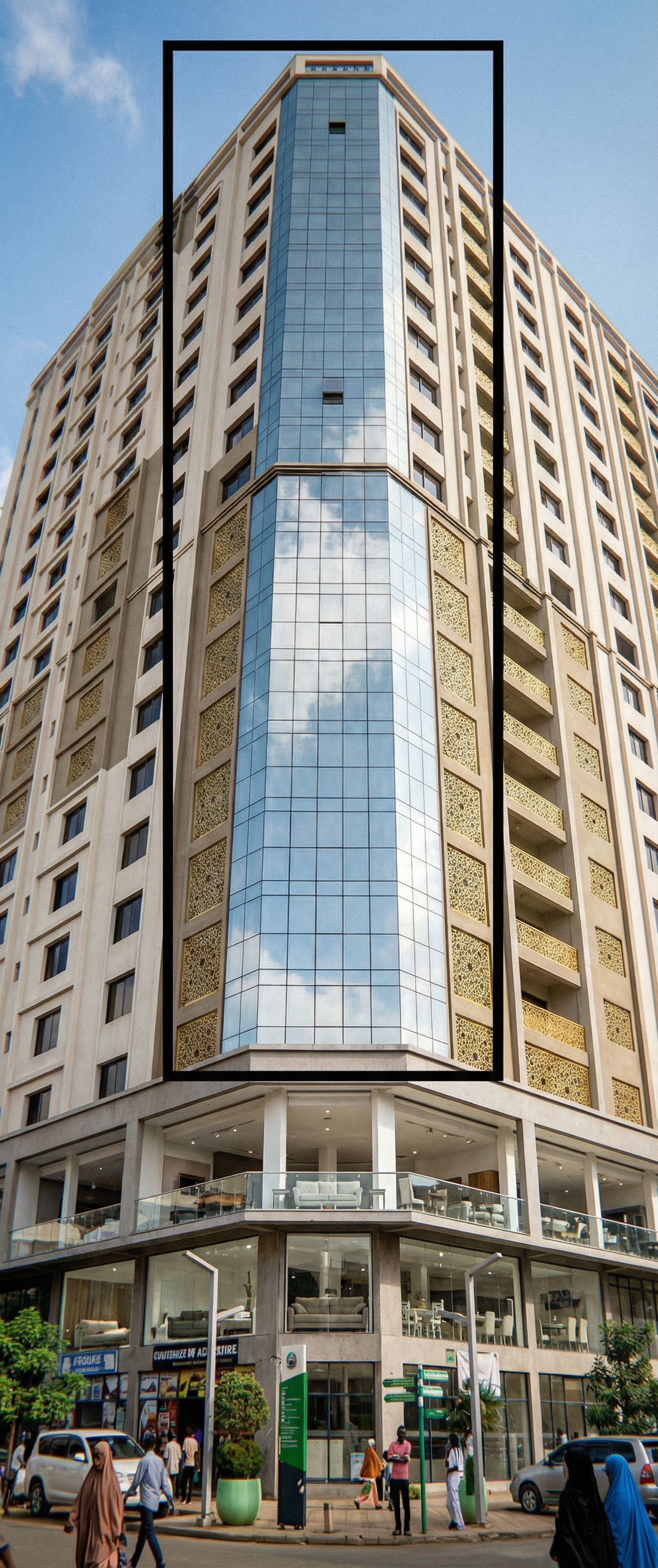 RESTRICT MASHRAYBYA TO THE MARKED AREA IN BLACK AND LET IT FRAME THE CURTAIN WALLING. USE THE COMBINATION OF COLOURS IN THE REFERENCE IMAGE. MAKE FIRST FLOOR COMMERCIAL WITH A CLEAR GLASS BALCONY. SHOW WHOLE BUILDING TO THE TOPO. FIRST FLOOR AS A FURNITURE SHOP WITH CLEAR GLASS DISPLAY. BLEND THE MASHRAYBYA COLOUR WITH THE REFERENCE COLOURS., keep exact camera angle