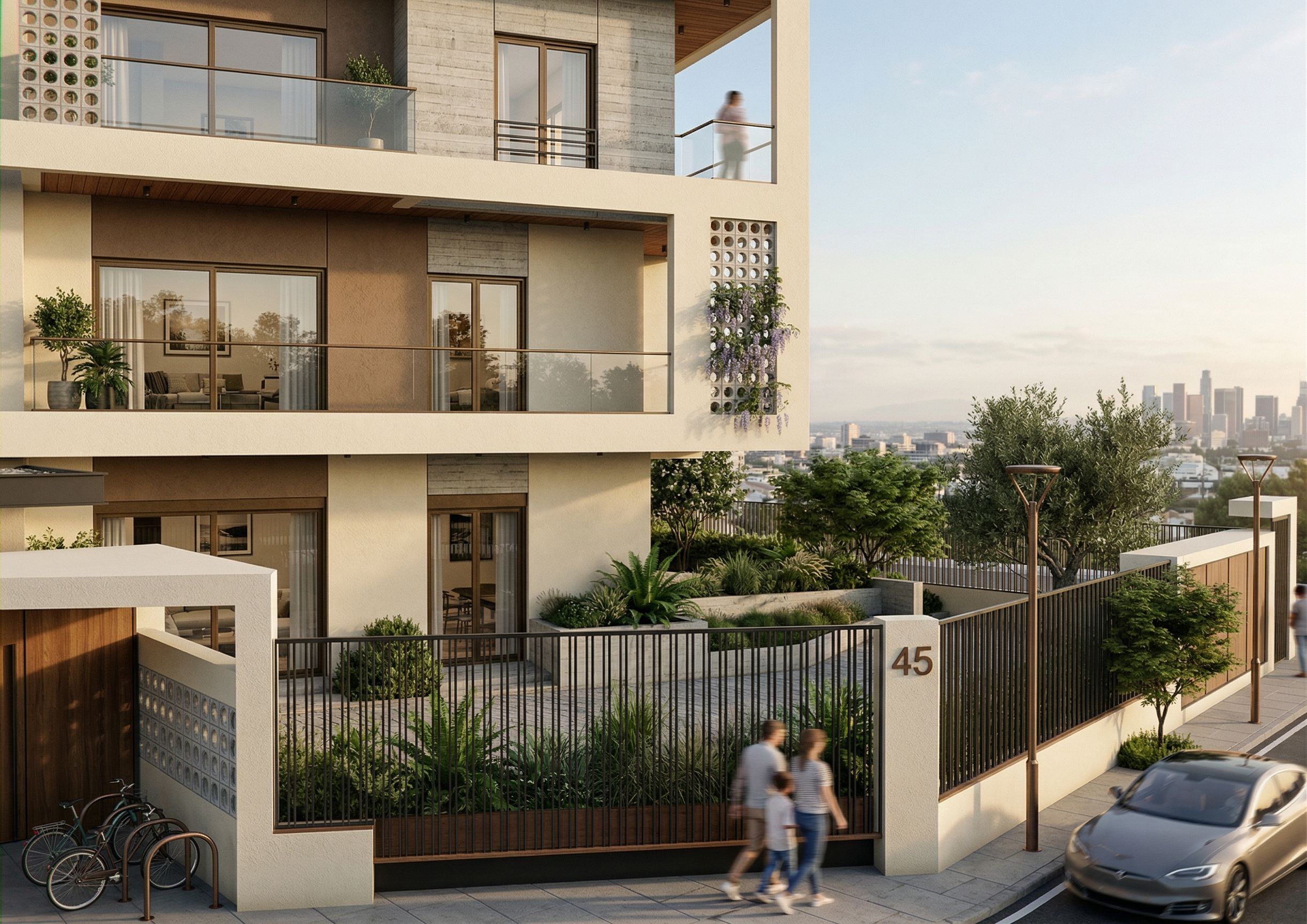 PromptModern block with large bronze windows, materials such as concrete,vanilla plaster,brown plaster metal, Cement Breeze Blocks surrounded with greenery. , keep exact camera angle